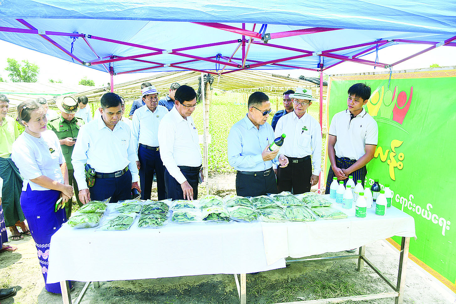 ဦးစွာ နိုင်ငံတော်စီမံအုပ်ချုပ်ရေးကောင်စီဒုတိယဥက္ကဋ္ဌ ဒုတိယဝန်ကြီးချုပ်နှင့် အဖွဲ့ဝင်များသည် ညောင်နှစ်ပင်စိုက်ပျိုးမွေးမြူရေးအထူးဇုန်ရှိ စိမ်းလန်းစိုက်ပျိုးထုတ်လုပ်ရေးနှင့် အထွေထွေရောင်းဝယ်ရေး သမဝါယမအသင်းလီမိတက်အသင်းနှင့် “ထွန်း” ဓာတုကင်းလွတ်သမဝါယမအသင်း စိုက်ပျိုးရေးခြံများသို့ရောက်ရှိပြီး မုန်ညင်း စိမ်း/ ဖြူ၊ ယုဆိုင်၊ ထိုင်ဝမ်မုန်ညင်း၊ ဆလပ်၊ ချဉ်ပေါင်၊ မုန်လာ၊ ဖက်ဖယ်၊ ကင်ပွန်းချဉ်၊ ဆူးပုပ်၊ နံနံပင်နှင့် အခြားရာသီပေါ်သီးနှံများ စိုက်ပျိုးထားရှိမှု၊ ခြံထွက်ဟင်းသီးဟင်းရွက်များ၊ ဈေးကွက်တင်ပို့မှုနှင့် အပင်စွန့်ပစ်ပစ္စည်းနှင့် အီးအမ်ဘိုကာရှီ ရောစပ်ထားသည့် ရွက်ဖျန်းအားတိုးဆေး၊ ကာကွယ်ဆေးများ အသုံးပြုမှုတို့ကို လိုက်လံ ကြည့်ရှုပြီး သိရှိလိုသည်များကို မေးမြန်းဆွေးနွေးသည်။