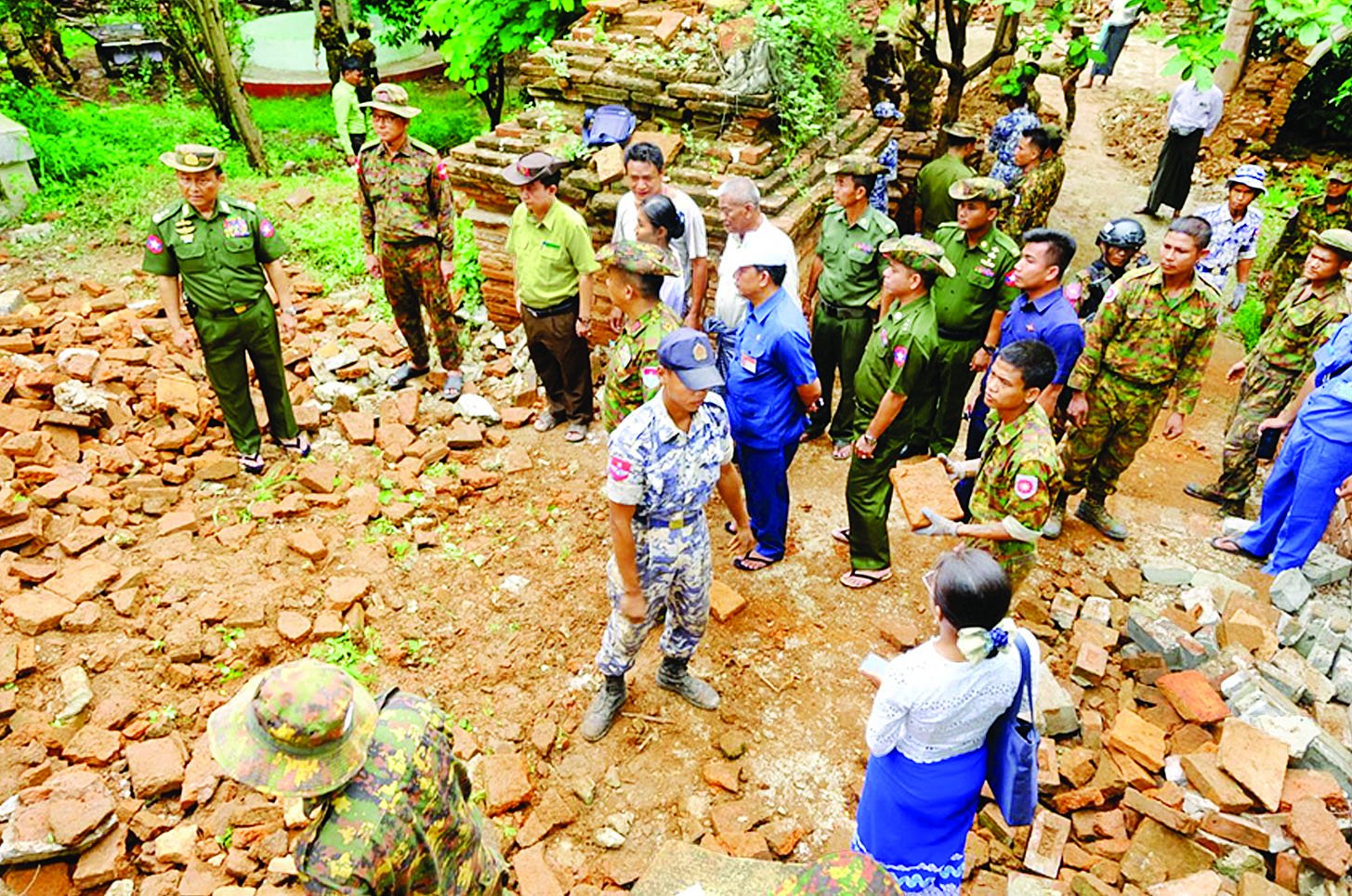 အလားတူ ကာကွယ်ရေးဦးစီးချုပ်ရုံး (ကြည်း) မှ ဒုတိယဗိုလ်ချုပ်ကြီး စိုးတင့်နိုင်နှင့် တာဝန်ရှိသူများသည် မန္တလေးမြို့ အမရပူရမြို့နယ် တိုးချဲ့ (၄) ရပ်ရှိ တြိရတနာမဟာအောင်မြေမြတ်စွာဘုရား ခြောက်ဆူကုန်းတော်သို့ သွားရောက်၍ ငလျင်ဒဏ်ကြောင့် ပြိုကျပျက်စီးသွားသော စေတီပုထိုးများနှင့် ဘုရားပရဝဏ်အတွင်းရှိ ရှေးဟောင်းအုတ်ကျောင်းတော်ကြီးတို့၌ တပ်မတော်သားများက ဖယ်ရှားရှင်းလင်းနေမှုတို့ကို ကြည့်ရှု၍ လိုအပ်သည်များ ပေါင်းစပ်ညှိနှိုင်းဆောင်ရွက်ပေးသည်။