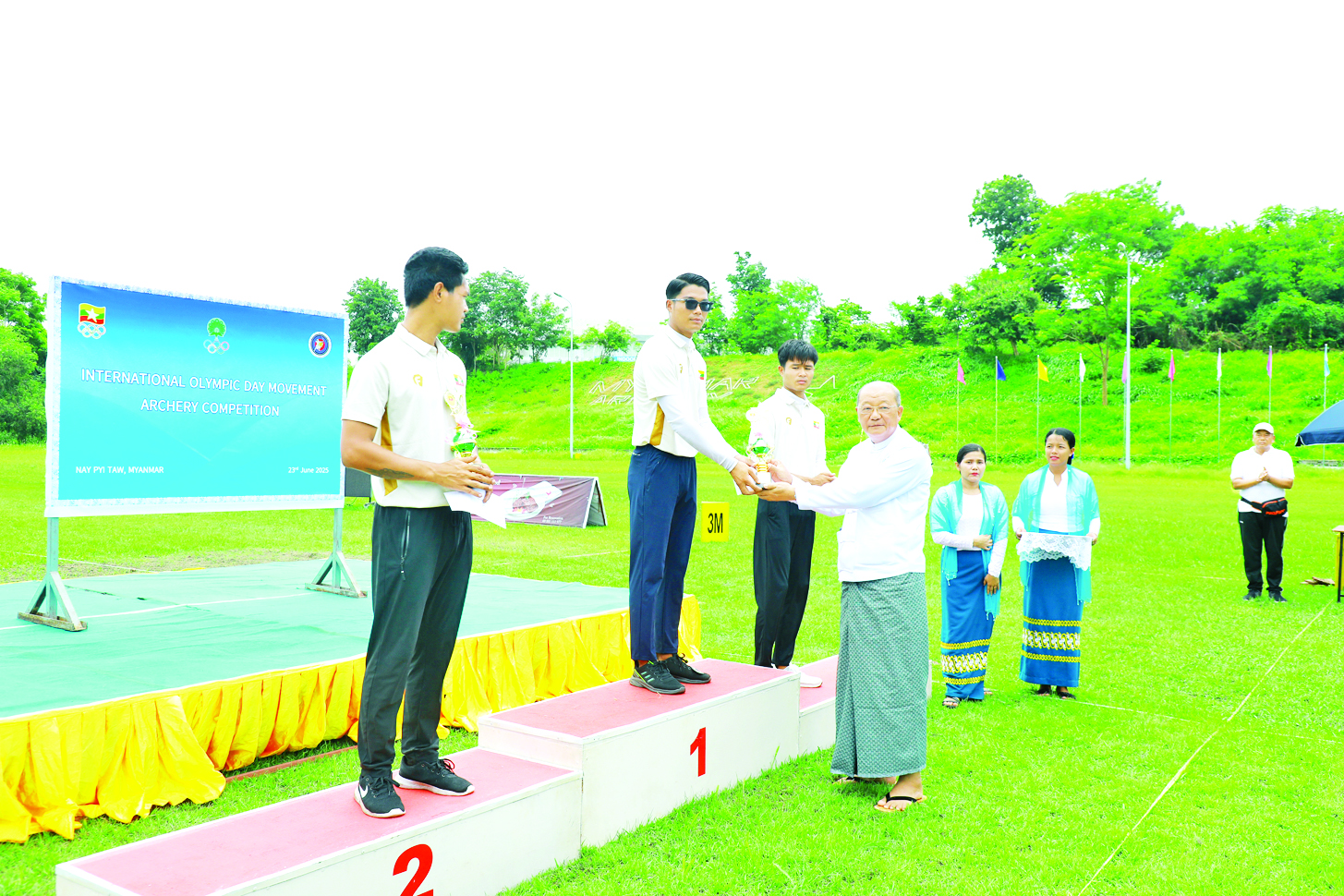 ၂၀၂၅ ခုနှစ် အပြည်ပြည်ဆိုင်ရာ အိုလံပစ်နေ့အထိမ်းအမှတ် မြားပစ်ပြိုင်ပွဲနှင့် ဆုပေးပွဲအခမ်းအနားကို ယနေ့နံနက်ပိုင်းတွင် နေပြည်တော် ဝဏ္ဏသိဒ္ဓိအားကစားကွင်းရှိ မြားပစ်လေ့ကျင့်ရေးကွင်း၌ ကျင်းပရာ မြန်မာနိုင်ငံအိုလံပစ်ကော်မတီဥက္ကဋ္ဌ အားကစားနှင့်လူငယ်ရေးရာဝန်ကြီးဌာန ပြည်ထောင်စုဝန်ကြီး Jeng Phang နော်တောင်၊ မြန်မာနိုင်ငံအိုလံပစ်ကော်မတီ အထွေထွေအတွင်းရေးမှူး၊ ဒုတိယဝန်ကြီးများဖြစ်ကြသည့် ဦးထိန်လင်း၊ ဦးဇင်မင်းထက်၊ ဌာနဆိုင်ရာများ၊ မြန်မာနိုင်ငံမြားပစ်အဖွဲ့ချုပ်ဥက္ကဋ္ဌနှင့် တာဝန်ရှိသူများ တက်ရောက်ကြည့်ရှုအားပေးကြသည်။