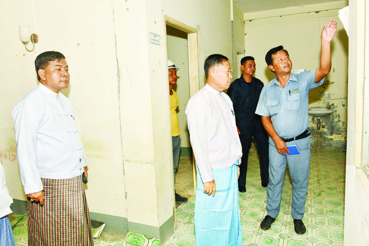 ထို့နောက် နိုင်ငံတော်စီမံအုပ်ချုပ်ရေးကောင်စီဒုတိယဥက္ကဋ္ဌ ဒုတိယဝန်ကြီးချုပ်နှင့် အဖွဲ့ဝင်များသည် ဇမ္ဗူသီရိမြို့နယ် ဉာဏသိဒ္ဓိရပ်ကွက်ရှိ လိမ္မော်အရောင်အဆင့်သတ်မှတ်ထားသည့် တိုက်အမှတ် ၃၃၈၄ နှင့် အပြာရောင်အဆင့်သတ်မှတ်ထားသောတိုက်အမှတ် ၃၃၈၃ သို့ ရောက်ရှိကြပြီး မြန်မာနိုင်ငံလိုင်စင်ရ ကန်ထရိုက်တာများအသင်းက ငလျင်ကြောင့် ပျက်စီးခဲ့မှုများအား အဆောက်အဦများ ပြန်လည်ပြုပြင်အသုံးပြုရေးနှင့် အသစ်တည်ဆောက်ရေးကြီးကြပ်မှုကော်မတီမှ ထုတ်ပြန်ထားသည့် SOP များနှင့်အညီ ပြန်လည်ပြုပြင်ခြင်းလုပ်ငန်းများ ဆောင်ရွက်နေမှုကို လိုက်လံကြည့်ရှုစစ်ဆေးပြီး ပြန်လည်ပြုပြင်ခြင်းလုပ်ငန်းများဆောင်ရွက်စဉ် ပြန်လည်ဆယ်တင် ပြင်ဆင်အသုံးပြုနိုင်သည့်ပစ္စည်းများကို လေလွင့်ဆုံးရှုံးမှုမရှိစေရေး ဆောင်ရွက်သွားရန်၊ ပြန်လည်ပြင်ဆင်ခြင်းလုပ်ငန်းများပြီးစီးပါက အခန်းတွင်း၊ အခန်းအပြင်နှင့် အိမ်ရာပတ်ဝန်းကျင် သန့်ရှင်းရေးများ ဆောင်ရွက်ပေးရန်၊ ရေလိုင်း၊ မီးလိုင်းများနှင့် အခြားလိုအပ်သည်များကို စနစ်တကျစစ်ဆေးပြီး စီမံဆောင်ရွက်ပေးသွားရန် တာဝန်ရှိသူများအားမှာကြားသည်။