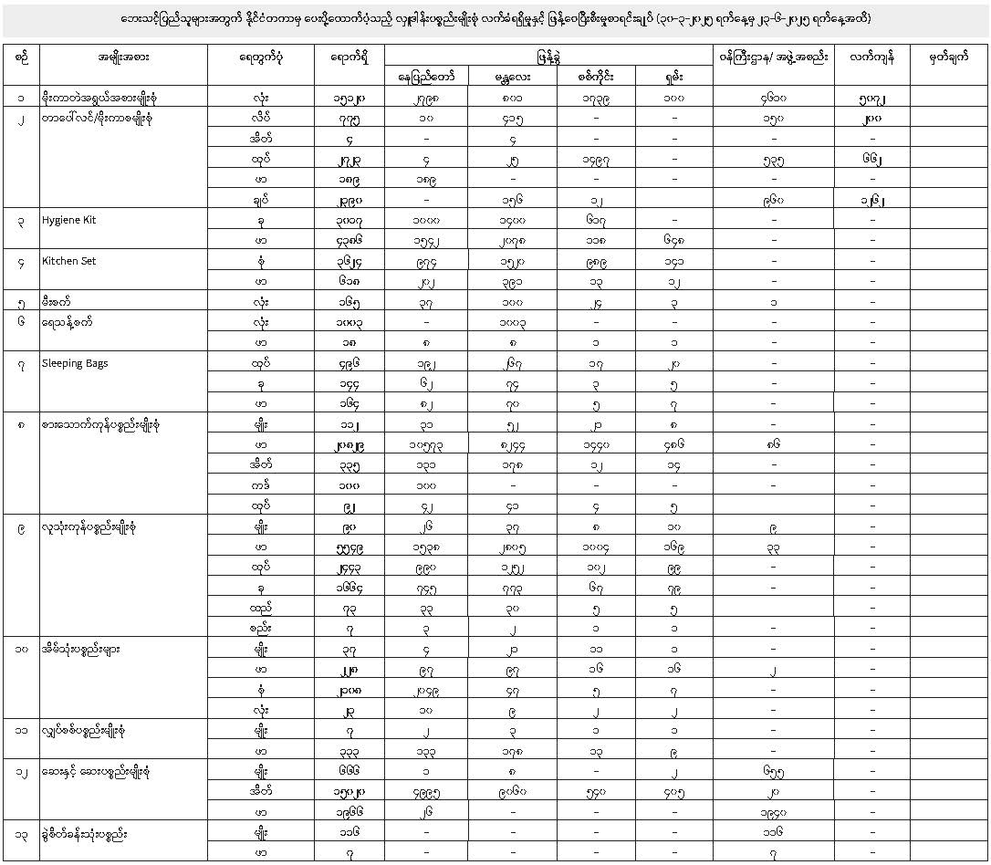 နိုင်ငံတကာအလှူရှင်များက ၁၁-၆-၂၀၂၅ ရက်နေ့မှ ၂၃-၆-၂၀၂၅ ရက်နေ့အထိ ရက်သတ္တပတ် နှစ်ပတ်အတွင်း ပေးပို့လှူဒါန်းသည့် ပစ္စည်းများအား ဘေးသင့်ပြည်သူများအတွက် ဖြန့်ခွဲပေးပို့နိုင်ရေး ဆောင်ရွက်ထားရှိမှုကို ပူးတွဲပါဇယားများဖြင့် ဖော်ပြအပ်ပါသည်။