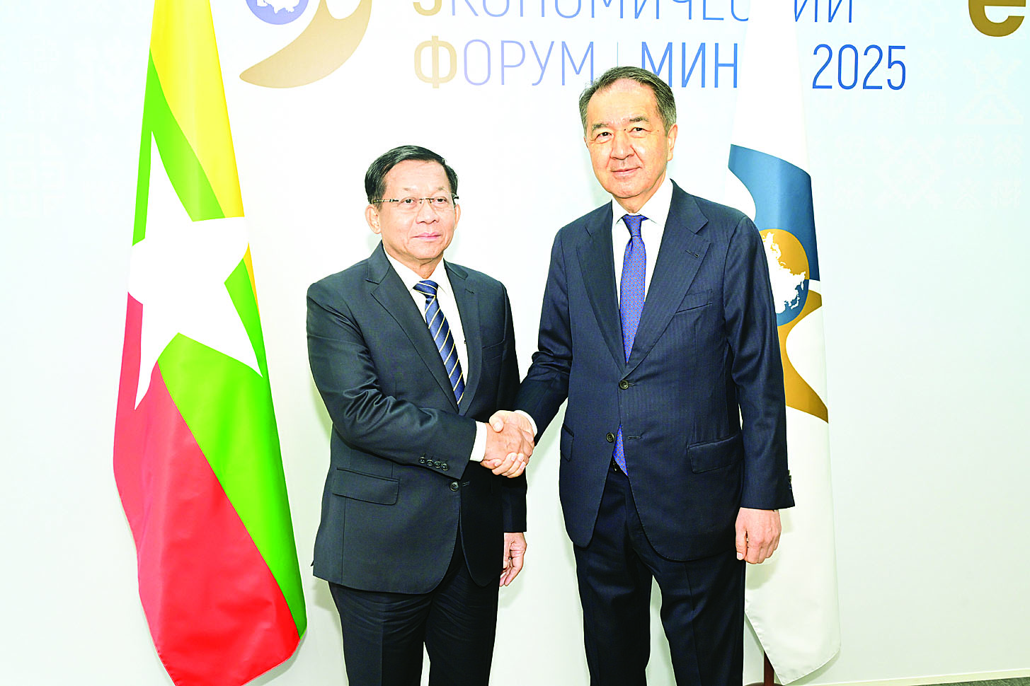 ဆက်လက်ပြီး နိုင်ငံတော်စီမံအုပ်ချုပ်ရေးကောင်စီဥက္ကဋ္ဌ နိုင်ငံတော်ဝန်ကြီးချုပ်နှင့် ဥရောပ-အာရှ စီးပွားရေးကော်မရှင် ဘုတ်အဖွဲ့ဥက္ကဋ္ဌတို့သည် မြန်မာနိုင်ငံနှင့် (EAEU) အဖွဲ့ဝင်နိုင်ငံများအကြား စီးပွားရေးဆိုင်ရာပူးပေါင်းဆောင်ရွက်မှုများကို မြှင့်တင်ဆောင်ရွက်သွားနိုင်မည့်ကိစ္စရပ်များ၊ မြန်မာနိုင်ငံ၏ စိုက်ပျိုးရေးကဏ္ဍမြှင့်တင်ရေး၊ သယ်ယူပို့ဆောင်ရေးကဏ္ဍမြှင့်တင်ရေး၊ သတ္တုတူးဖော်မှုဆိုင်ရာ နည်းပညာမြှင့်တင်ရေးနှင့် စွမ်းအင်ကဏ္ဍမြှင့်တင်ရေးတို့တွင် နည်းပညာပိုင်းဆိုင်ရာ၊ ပူးပေါင်းဆောင်ရွက်မှုဆိုင်ရာ လုပ်ဆောင်သွားနိုင်မည့် ကိစ္စရပ်များ၊ မြန်မာနိုင်ငံနှင့် (EAEU) အဖွဲ့ဝင်နိုင်ငံများအကြား တိုက်ရိုက်ကုန်သွယ်မှုနှင့် ရင်းနှီးမြှုပ်နှံမှုများ ပြုလုပ်ခြင်း၊ ကုန်စည်ပြပွဲများ၊ ဖိုရမ်များ ကျင်းပခြင်းတို့ဖြင့် စီးပွားရေးကုန်သွယ်မှုအခွင့်အလမ်းကို ပိုမိုအရှိန်အဟုန်မြှင့်တင်ဆောင်ရွက်နိုင်မည့် ကိစ္စရပ်များ၊ မြန်မာနိုင်ငံအနေဖြင့် ဥရောပ - အာရှ စီးပွားရေးသမဂ္ဂ (EAEU) ၏ လေ့လာသူနိုင်ငံအဆင့်အထိ တက်လှမ်းနိုင်ရေးကူညီဆောင်ရွက်ပေးသွားမည်ဖြစ်ပြီး စီးပွားရေးဆိုင်ရာ ပူးပေါင်းဆောင်ရွက်မှု အလားအလာကောင်းများစွာကို ဖော်ဆောင်ပေးနိုင်မည့် ကိစ္စရပ်များနှင့် ပတ်သက်၍ ရင်းနှီးပွင့်လင်းစွာ အမြင်ချင်းဖလှယ်ဆွေးနွေးခဲ့ကြသည်။