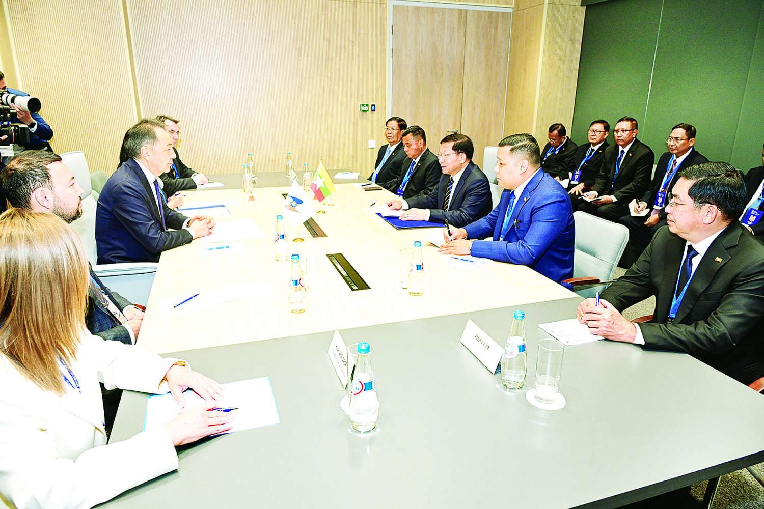 ယင်းနောက် နိုင်ငံတော်စီမံအုပ်ချုပ်ရေးကောင်စီဥက္ကဋ္ဌ နိုင်ငံတော်ဝန်ကြီးချုပ်က ယခုတွေ့ဆုံဆွေးနွေးမှုမှတဆင့် မိမိတို့မြန်မာနိုင်ငံနှင့် ဥရောပ-အာရှ စီးပွားရေးသမဂ္ဂ (EAEU) အဖွဲ့ဝင်နိုင်ငံများအကြား ပူးပေါင်းဆောင်ရွက်မှုများကို လက်တွေ့အကောင်အထည်ဖော်ဆောင်ရွက်နိုင်ရန် တွန်းအားဖြစ်စေမည်ဟု ယုံကြည်ကြောင်း၊ မြန်မာနိုင်ငံနှင့် ဥရောပ-အာရှ စီးပွားရေးသမဂ္ဂ (EAEU) တို့အကြား ၂၀၂၃ ခုနှစ်တွင် ပူးပေါင်းဆောင်ရွက်မှုစာချွန်လွှာ လက်မှတ်ရေးထိုးခဲ့ပြီးဖြစ်ကြောင်း၊ ထို့ပြင် ၂၀၂၃ ခုနှစ်၊ ဇွန်လတွင် ရုရှားဖက်ဒရေးရှင်းနိုင်ငံ၊ စိန့်ပီတာစဘတ်မြို့၌ ပြည်ထောင်စုသမ္မတမြန်မာ နိုင်ငံတော်အစိုးရနှင့် ဥရောပ-အာရှစီးပွားရေးကော်မရှင် (EEC) တို့အကြား ပူးပေါင်းဆောင်ရွက်မှုစာချွန်လွှာ (Memorandum of Cooperation-MOC) အား လက်မှတ်ရေးထိုးနိုင်ခဲ့ကြောင်း၊ မြန်မာနိုင်ငံနှင့် (EAEU) အဖွဲ့ဝင်နိုင်ငံများအကြား ပူးပေါင်းဆောင်ရွက်နိုင်မည့် အခွင့်အလမ်းများစွာကိုလည်း လေ့လာတွေ့ရှိရပါကြောင်း၊ လက်မှတ်ရေးထိုးထားသည့် ပူးပေါင်းဆောင်ရွက်မှုစာချွန်လွှာအား အကောင်အထည်ဖော်ဆောင်ရွက်ခြင်းမှတဆင့် ဥရောပ-အာရှ စီးပွားရေးသမဂ္ဂ (EAEU) ၏ လေ့လာသူနိုင်ငံအဆင့်အထိ တက်လှမ်းနိုင်မည်ဟုလည်း ယုံကြည်မျှော်လင့်ထားကြောင်း၊ မြန်မာနိုင်ငံအနေဖြင့် လက်တွေ့အကောင်အထည်ဖော်ဆောင်ရွက်မှုများဖြင့် ပူးပေါင်းဆောင်ရွက်မှုကို ပိုမိုခိုင်မာကျယ်ပြန့်စေရေးဆောင်ရွက်သွားမည်ဖြစ်ကြောင်းဖြင့် ပြန်လည်ဆွေးနွေးပြောကြားသည်။
