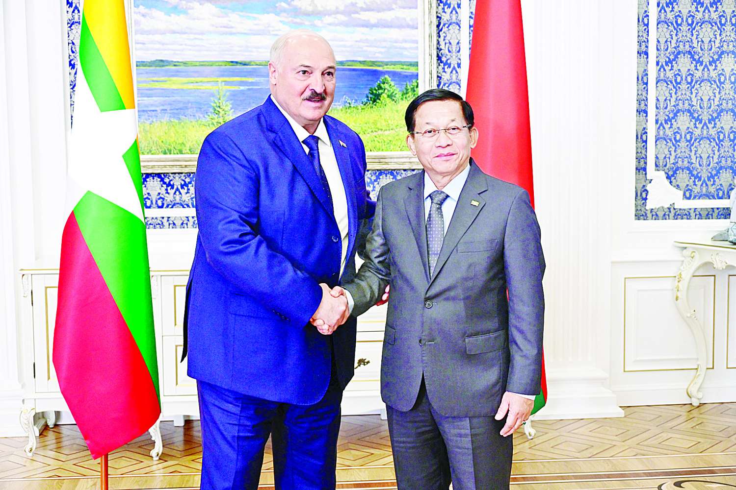 နိုင်ငံတော်စီမံအုပ်ချုပ်ရေးကောင်စီဥက္ကဋ္ဌ နိုင်ငံတော်ဝန်ကြီးချုပ် ဗိုလ်ချုပ်မှူးကြီး မင်းအောင်လှိုင်သည် ယနေ့မွန်းလွဲပိုင်းတွင် ဘယ်လာရုစ်သမ္မတနိုင်ငံသမ္မတ H.E. Mr. Alexander Gregoryevich Lukashenko နှင့် ဘယ်လာရုစ်နိုင်ငံမင့်စ်မြို့ရှိ သမ္မတနန်းတော်ဧည့်ခန်းမဆောင်၌ တွေ့ဆုံဆွေးနွေးသည်။