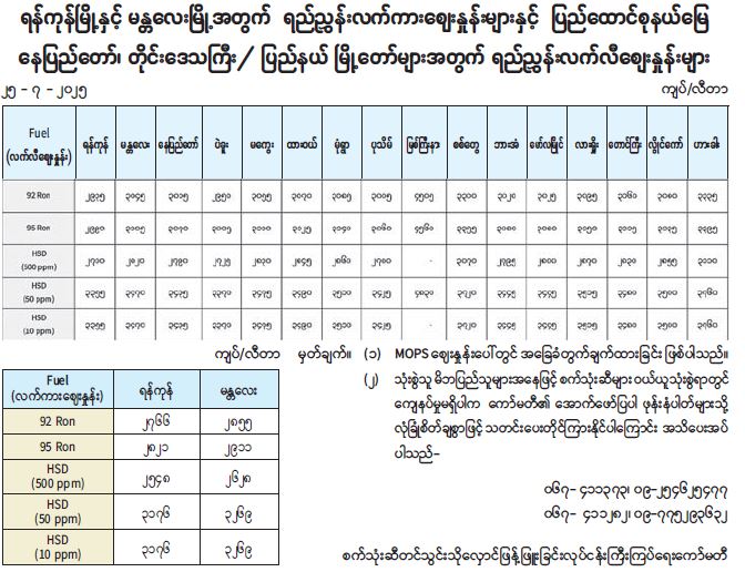 ရန်ကုန်မြို့နှင့် မန္တလေးမြို့အတွက် ရည်ညွှန်းလက်ကားဈေးနှုန်းများနှင့် ပြည်ထောင်စုနယ်မြေ နေပြည်တော်၊ တိုင်းဒေသကြီး/ပြည်နယ် မြို့တော်များအတွက် ရည်ညွှန်းလက်လီဈေးနှုန်းများ 07/25/2025