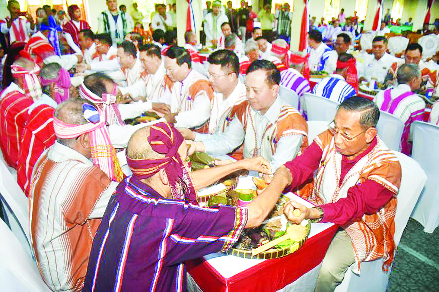 ယင်းနောက် နိုင်ငံတော်စီမံအုပ်ချုပ်ရေးကောင်စီအဖွဲ့ဝင် မန်းငြိမ်းမောင်နှင့် ဧည့်သည်တော်များအား ဘိုးဘွားများကကရင်ရိုးရာ ချည်ဖြူဖွဲ့ပေးခဲ့ကြပြီး ကရင်ရိုးရာဝါခေါင်လချည်ဖြူဖွဲ့ မင်္ဂလာအခမ်းအနားစည်ကားသိုက်မြိုက်စွာ ကျင်းပကြသည်။