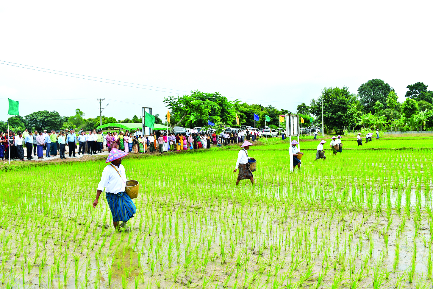ယင်းနောက် နွားလဝိုးရွာမ ကွင်းအမှတ် (၁၂၆) တောင်သူ ဦးစိုးရွှေ၏ မိုးစပါးစံပြစိုက်ခင်းအတွင်း ယူရီးယားဓာတ်မြေသြဇာများ စုပေါင်းကြဲပက်နေမှုနှင့် တောင်သူများအား ပိုးသတ်ဆေး၊ ပေါင်းသတ်ဆေး၊ မှိုသတ်ဆေးနှင့် အသီး၊ အရွက်၊ အပင်သန်ဆေးများ စနစ်တကျသုံးစွဲနိုင်ရန် သရုပ်ပြရှင်းလင်းခြင်းကို ကြည့်ရှုအားပေးသည်။