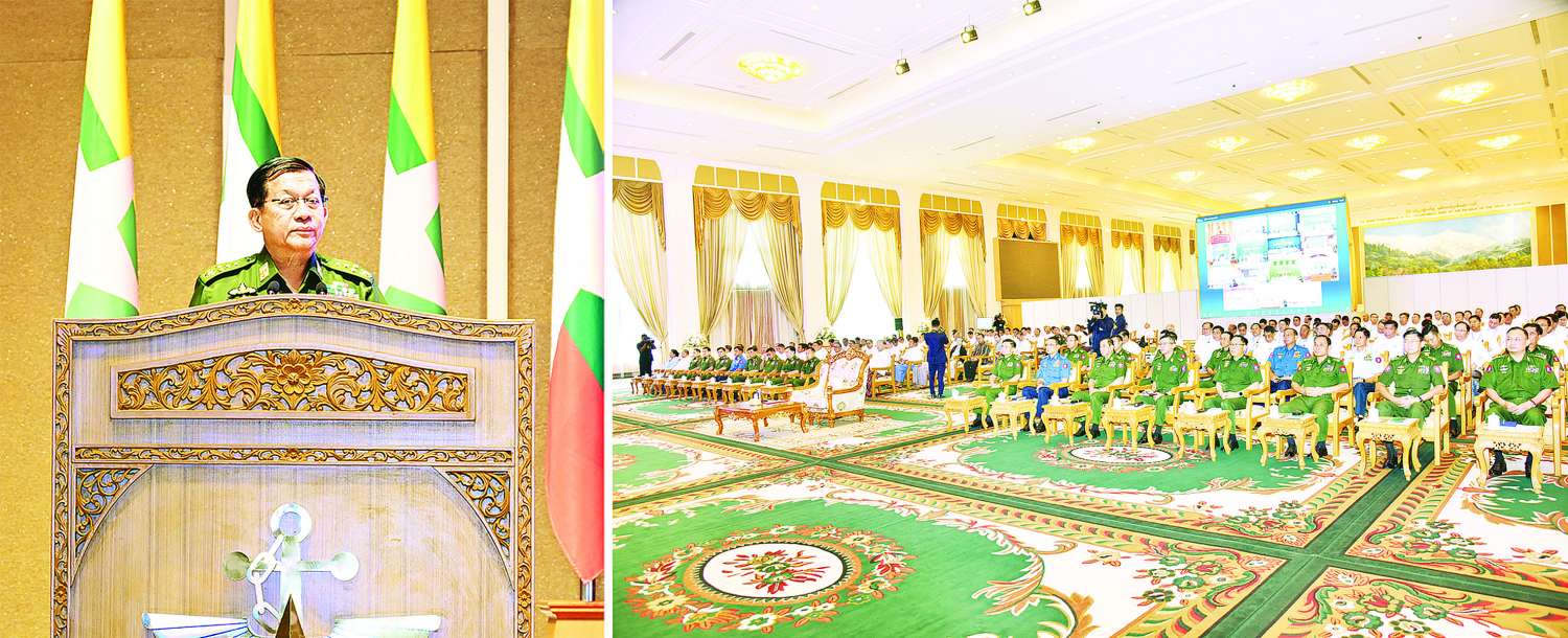 ပြည်ထောင်စုသမ္မတမြန်မာနိုင်ငံတော် နိုင်ငံတော်စီမံအုပ်ချုပ်ရေးကောင်စီ ဂုဏ်ပြုတွေ့ဆုံပွဲအခမ်းအနားကို ယနေ့နံနက်ပိုင်းတွင် နေပြည်တော်ရှိ ဇေယျာသီရိဗိမာန် ရေခဲတောင်ခန်းမ၌ ကျင်းပပြုလုပ်ရာ နိုင်ငံတော်စီမံအုပ်ချုပ်ရေးကောင်စီဥက္ကဋ္ဌ နိုင်ငံတော်ဝန်ကြီးချုပ်ဗိုလ်ချုပ်မှူးကြီးမင်းအောင်လှိုင် တက်ရောက်အမှာစကားပြောကြားသည်။