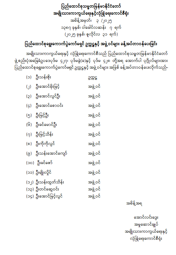 ပြည်ထောင်စုရွေးကောက်ပွဲကော်မရှင် ဥက္ကဋ္ဌနှင့် အဖွဲ့ဝင်များ ခန့်အပ်တာဝန်ပေးခြင်း