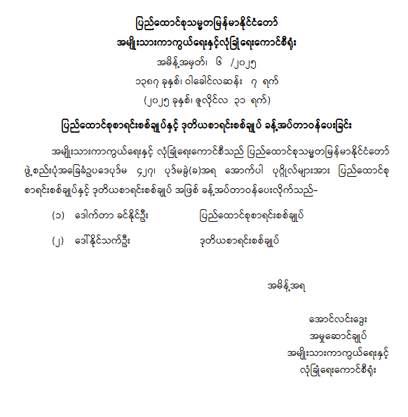 ပြည်ထောင်စုစာရင်းစစ်ချုပ်နှင့် ဒုတိယစာရင်းစစ်ချုပ် ခန့်အပ်တာဝန်ပေးခြင်း