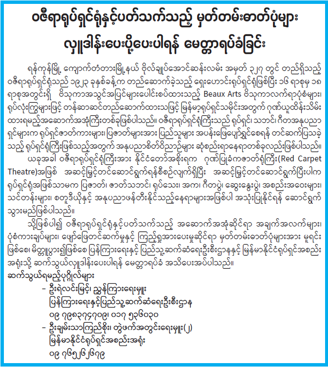 သို့ဖြစ်ပါ၍ ဝဇီရာရုပ်ရှင်ရုံနှင့်ပတ်သက်သည့် အဆောက်အအုံဆိုင်ရာအချက်အလက်များ၊ ပုံစံကားချပ်များ၊ ဖျော်ဖြေတင်ဆက်မှုနှင့် ကြည့်ရှုအားပေးမှုဆိုင်ရာ မှတ်တမ်းဓာတ်ပုံများအား မူရင်းဖြစ်စေ၊ မိတ္တူပွား၍ဖြစ်စေ ပြန်ကြားရေးနှင့်ပြည်သူ့ဆက်ဆံရေးဦးစီးဌာနနှင့် မြန်မာနိုင်ငံရုပ်ရှင်အစည်းအရုံးသို့ ဆက်သွယ်လှူဒါန်းပေးပါရန် မေတ္တာရပ်ခံအသိပေးအပ်ပါသည်။