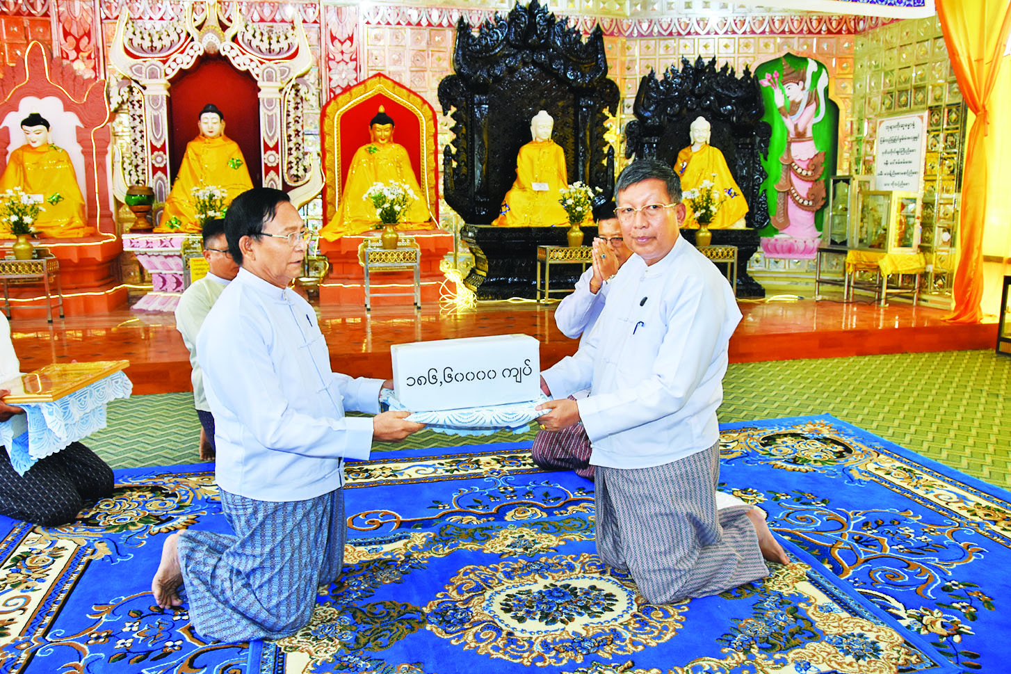 ထို့နောက် ပြည်ထောင်စုဝန်ကြီးက တံခွန်တိုင်အလှူငွေကျပ် ၁၈၆၆၀၀၀၀ ကို စေတီတော် ဂေါပကဖွဲ့ဥက္ကဋ္ဌ ဦးစိုးတင့်အား ပေးအပ်လှူဒါန်းပြီး စေတီတော်ဂေါပကအဖွဲ့ဥက္ကဋ္ဌက ပြည်ထောင်စုဝန်ကြီးအား ဂုဏ်ပြုမှတ်တမ်းလွှာပြန်လည်ပေးအပ်ကာ ကျေးဇူးတင်ဝမ်းမြောက်စကားပြောကြားသည်။