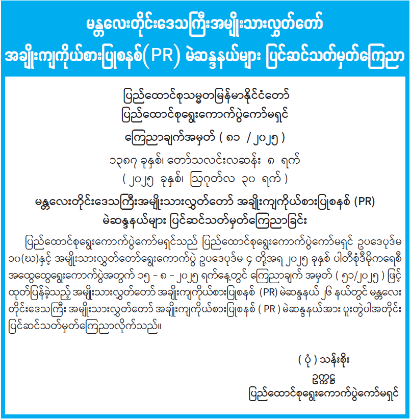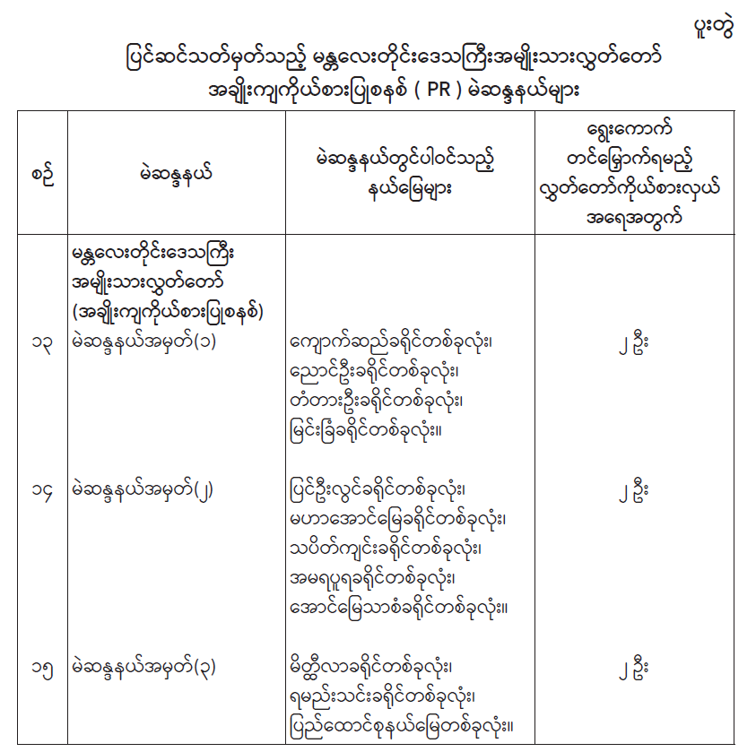 မန္တလေးတိုင်းဒေသကြီးအမျိုးသားလွှတ်တော် အချိုးကျကိုယ်စားပြုစနစ်(PR) မဲဆန္ဒနယ်များ ပြင်ဆင်သတ်မှတ်ကြေညာ 08/31/2025