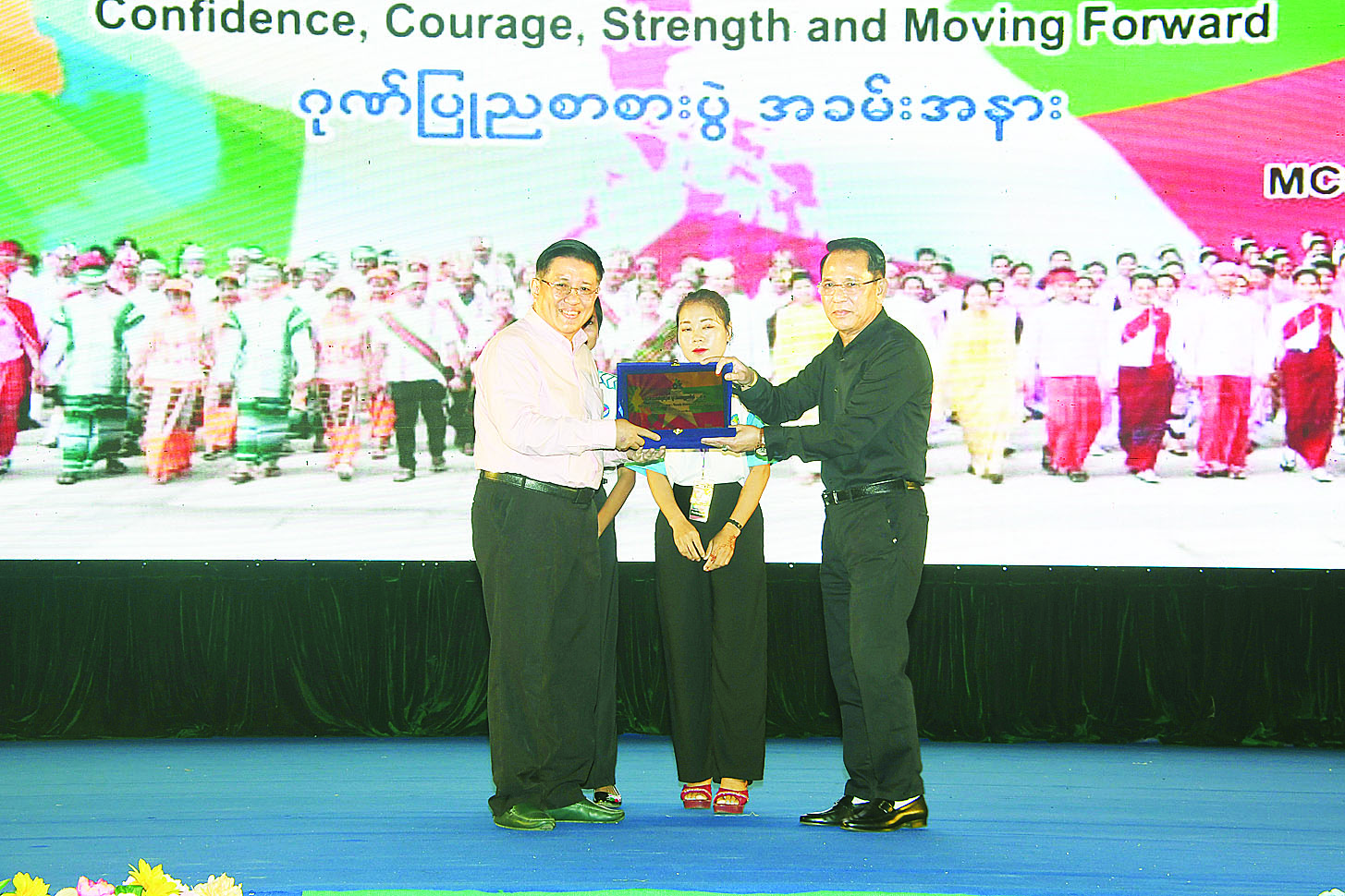 ယင်းနောက် ပြည်ထောင်စုဝန်ကြီးက မြန်မာ့ပုံရိပ်ဖော်ညွှန်းရေးအဖွဲ့ဥက္ကဋ္ဌ ဦးကိုကို (ကိုကိုစက်မှု တက္ကသိုလ်)၊ အားကစားနှင့်လူငယ်ရေးရာဝန်ကြီးဌာန ဒုတိယဝန်ကြီး ဦးဇင်မင်းထက်နှင့် နေပြည်တော်ကောင်စီ၊ တိုင်းဒေသကြီး/ ပြည်နယ်များမှ တာဝန်ရှိသူများနှင့် လူငယ်ရေးရာကိုယ်စားလှယ်များအား ဂုဏ်ပြုမှတ်တမ်းများ ပေးအပ်သည်။