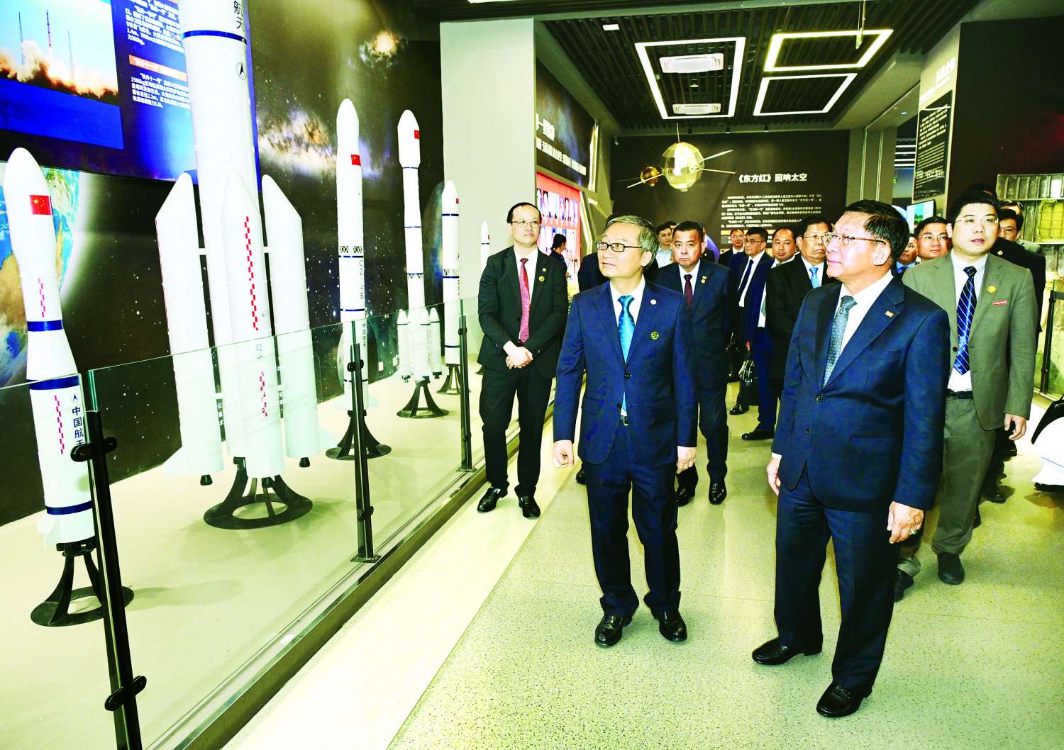 ယင်းနောက် တက္ကသိုလ်ပြတိုက်အတွင်း၌ တက္ကသိုလ်၏ မိတ်ဆက်ဗီဒီယိုအားကြည့်ရှုကြသည်။ ထို့နောက် အာကာသပြခန်းအတွင်း ခင်းကျင်းပြသထားသည့် မစ်ဇိုင်းများ ထုတ်လုပ်ခဲ့မှု၊ ဒုံးပျံများ၊ ဂြိုလ်တုများ သုတေသနပြုတီထွင်ထုတ်လုပ်ခဲ့မှု၊ နိုင်ငံတော်ကာကွယ်ရေးအတွက် နျူကလီးယားဗုံးနှင့် ဟိုက်ဒရိုဂျင်ဗုံးများ စမ်းသပ်တီထွင်အောင်မြင်ခဲ့မှု၊ ကဏ္ဍအလိုက် ဂြိုလ်တုများ တီထွင်ထုတ်လုပ်လွှတ်တင်ခဲ့မှု၊ အာကာသပိုင်းဆိုင်ရာအောင်မြင်မှုများ၊ လကမ္ဘာသို့ ဆင်းသက်မှုပြခန်း၊ အာကာသယာဉ်များလွှတ်တင်ခဲ့မှု၊ တရုတ်နိုင်ငံမှ ပေါ်ထွန်းခဲ့သည့် အာကာသပညာရှင်များပြခန်းတို့အား လှည့်လည်ကြည့်ရှုလေ့လာကြရာ တာဝန်ရှိသူများက ရှင်းလင်းတင်ပြကြသည်။