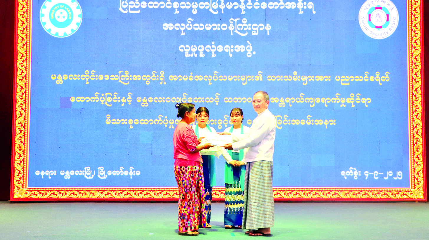 မန္တလေးတိုင်းဒေသကြီးအတွင်းရှိ အာမခံအလုပ်သမားများ၏ သားသမီးများအား ပညာသင်စရိတ်ထောက်ပံ့ခြင်းနှင့် မန္တလေးငလျင်ဘေးသင့် သဘာဝဘေးအန္တရာယ်ကျရောက်မှုဆိုင်ရာ မိသားစုထောက်ပံ့မှု အကျိုးခံစားခွင့်များပေးအပ်ခြင်းအခမ်းအနား ကျင်းပ