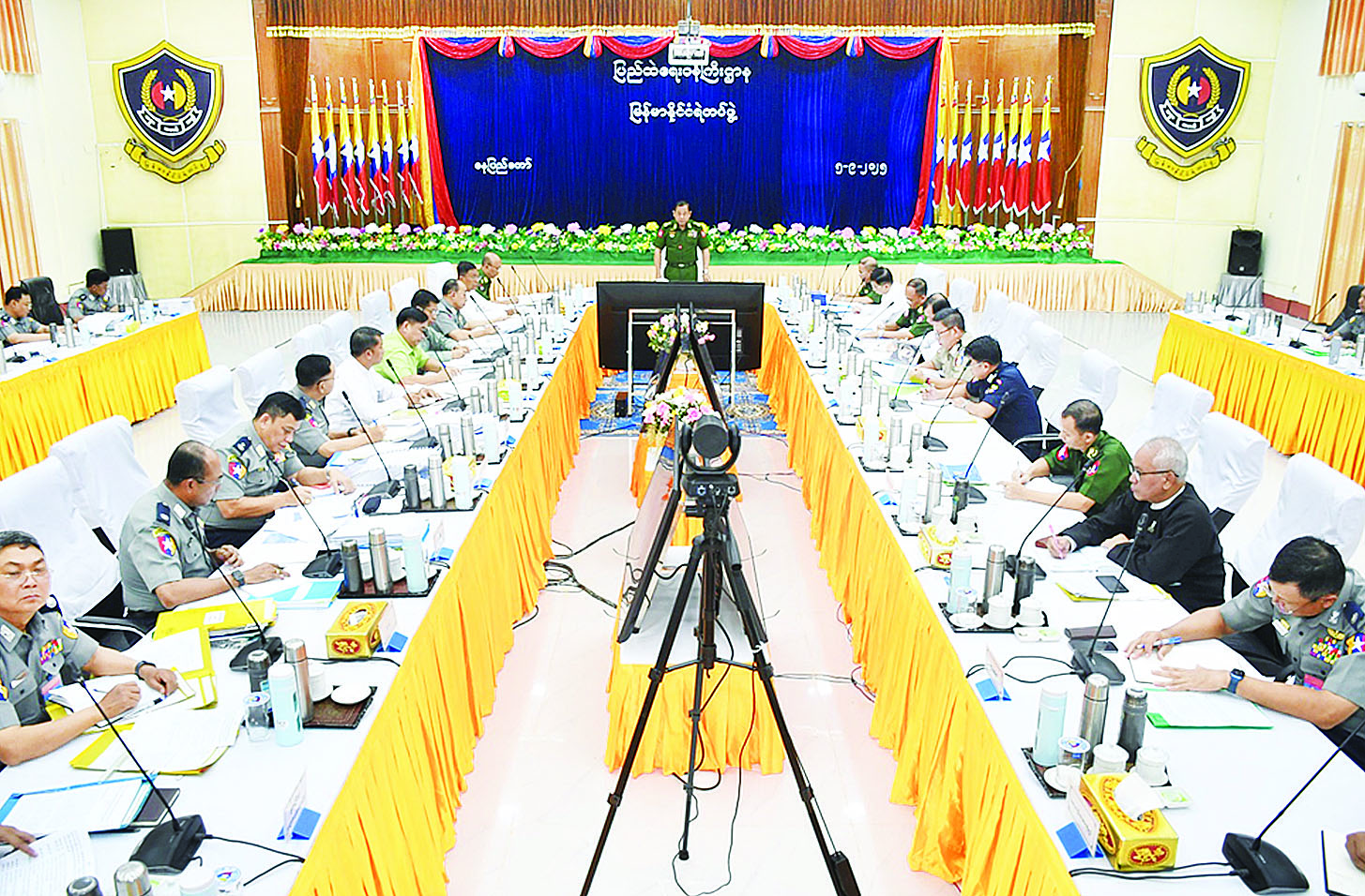 ပါတီစုံဒီမိုကရေစီအထွေထွေရွေးကောက်ပွဲကာလ လုံခြုံရေးဆိုင်ရာကြီးကြပ်မှုဗဟိုကော်မတီအစည်းအဝေး (၂/၂၀၂၅)ကို ယနေ့မွန်းလွဲပိုင်းတွင် မြန်မာနိုင်ငံရဲတပ်ဖွဲ့ဌာနချုပ် အရိန္ဒမာခန်းမ၌ကျင်းပရာ ပါတီစုံဒီမိုကရေစီ အထွေထွေရွေးကောက်ပွဲကာလ လုံခြုံရေးဆိုင်ရာ ကြီးကြပ်မှုဗဟိုကော်မတီဥက္ကဋ္ဌ ပြည်ထဲရေးဝန်ကြီးဌာန ပြည်ထောင်စုဝန်ကြီး ဒုတိယဗိုလ်ချုပ်ကြီး ထွန်းထွန်းနောင်၊ ဒုတိယဥက္ကဋ္ဌများ၊ ဗဟိုကော်မတီအဖွဲ့ဝင်များ၊ ပြည်ထောင်စုရွေးကောက်ပွဲကော်မရှင်မှ ကိုယ်စားလှယ်၊ နေပြည်တော်ပြည်ထောင်စုနယ်မြေ ပါတီစုံဒီမိုကရေစီအထွေထွေရွေးကောက်ပွဲကာလ လုံခြုံရေးဆိုင်ရာကြီးကြပ်မှုကော်မတီဥက္ကဋ္ဌနှင့်အဖွဲ့ဝင်များ တက်ရောက်ကြပြီး တိုင်းဒေသကြီး၊ ပြည်နယ်များမှ ပါတီစုံဒီမိုကရေစီအထွေထွေရွေးကောက်ပွဲကာလ လုံခြုံရေးဆိုင်ရာကြီးကြပ်မှုကော်မတီဥက္ကဋ္ဌနှင့်အဖွဲ့ဝင်များက Video Conferencing ဖြင့် တက်ရောက်ကြသည်။