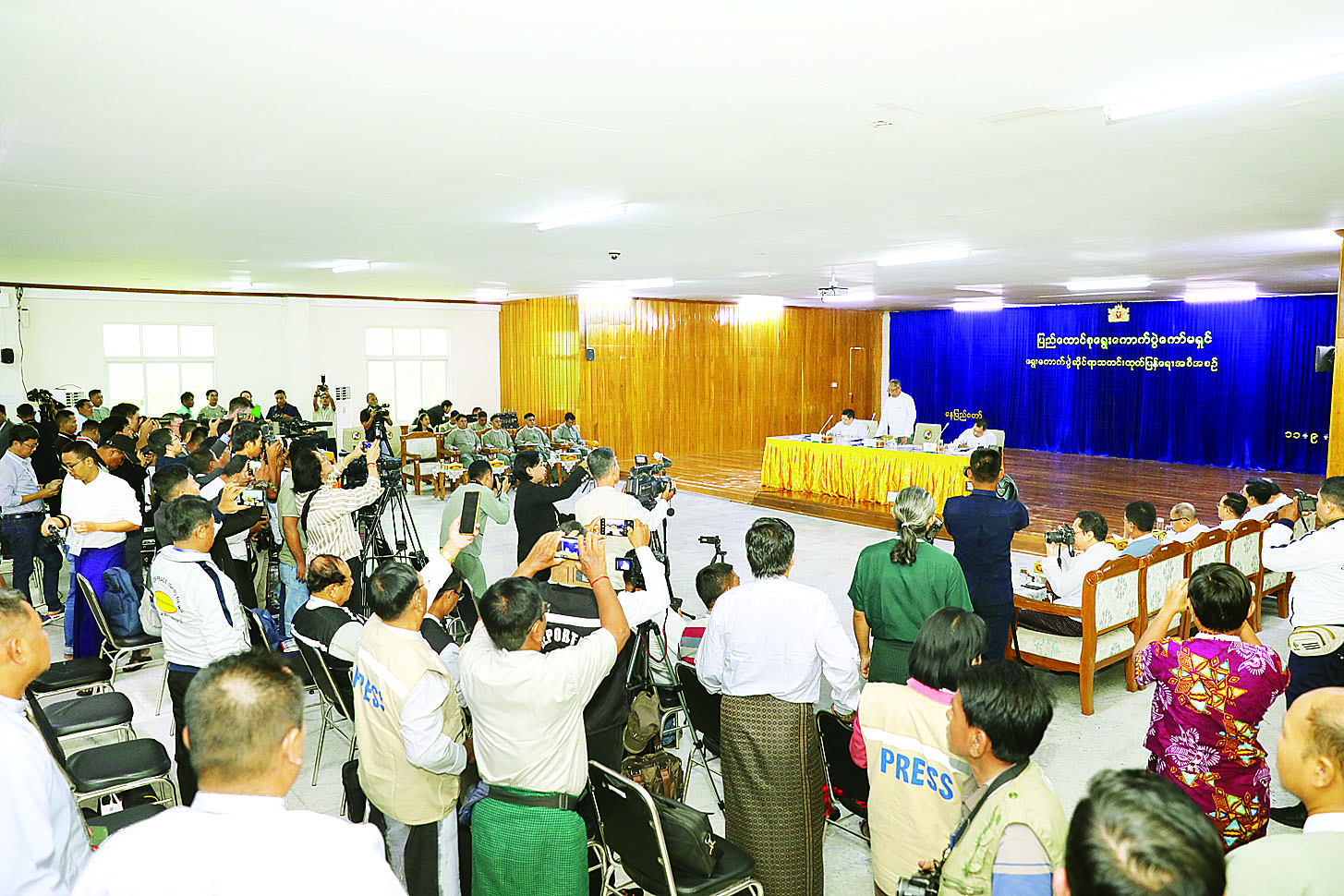 ပြည်ထောင်စုရွေးကောက်ပွဲကော်မရှင် ရွေးကောက်ပွဲဆိုင်ရာသတင်းထုတ်ပြန်ရေးအစီအစဉ်ကို ယနေ့မွန်းလွဲပိုင်းတွင် ပြည်ထောင်စုရွေးကောက်ပွဲကော်မရှင်ရုံး တိုးချဲ့ရုံးအဆောက်အအုံ၌ ကျင်းပရာ ပြည်ထောင်စုရွေးကောက်ပွဲကော်မရှင်အဖွဲ့ဝင် ဦးခင်မောင်ဦး၊ ဦးအောင်လွင်ဦးနှင့် ဦးမြင့်သိန်း၊ မြန်မာနိုင်ငံသတင်းမီဒီယာကောင်စီဥက္ကဋ္ဌ၊ ဒုတိယဥက္ကဋ္ဌ (၂) နှင့် တာဝန်ရှိသူများ၊ ပြည်ထောင်စုရွေးကောက် ပွဲကော်မရှင်ရုံးတာဝန်ရှိသူများ၊ ပြည်တွင်းမီဒီယာနှင့် ပြည်တွင်းအခြေစိုက် ပြည်ပမီဒီယာအဖွဲ့အစည်းများမှ သတင်းသမားများ တက်ရောက်သည်။