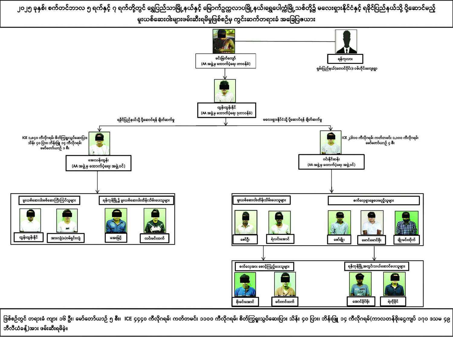 ဖမ်းဆီးရမိတရားခံ AA သောင်းကျန်းသူအဖွဲ့မှ ထောက်ပံ့ရေးဒုတိယတာဝန်ခံ အဆင့်ရှိ ထွန်းထွန်းနိုင်၏ ထွက်ဆိုချက်အရ AA သောင်းကျန်းသူအဖွဲ့အနေဖြင့် ၎င်းတို့အဖွဲ့ရပ်တည်နိုင်ရေးနှင့် လက်နက်၊ ခဲယမ်းများ ဝယ်ယူဖြည့်တင်းနိုင်ရေးအတွက် လိုအပ်သောငွေကြေးများရရှိနိုင်ရန် အနာဂတ်မျိုးဆက်သစ်လူငယ်များအပါအဝင် လူသားမျိုးနွယ်တစ်ခုလုံးအားအန္တရာယ်ဖြစ်စေသည့် မူးယစ်ဆေးဝါး သယ်ဆောင်ရောင်းဝယ်မှုများကို ကျယ်ပြန့်စွာ လုပ်ကိုင်လျက်ရှိကြောင်း၊ ယခု ၎င်းနှင့်အတူ ဖမ်းဆီးရမိခဲ့သည့် မူးယစ်ဆေးဝါးများကိုလည်း AA သောင်းကျန်းသူအဖွဲ့မှ ထောက်ပံ့ရေးတာဝန်ခံအဆင့်ရှိ ဖမ်းဆီးရန်ကျန် တရားခံမင်းမြတ်ကျော်(ခ)သာဓု၏ စေခိုင်းမှုဖြင့် ရှမ်းပြည်နယ်(တောင်ပိုင်း)၊ လွိုင်လင်ခရိုင်၊ ကျေးသီးမြို့နယ်၊ ဝမ်ဟိုင်းကျေးရွာနေဖမ်းဆီးရန်ကျန် တရားခံရန်ကုလားထံမှ ဝယ်ယူခဲ့ခြင်းဖြစ်ပြီး မလေးရှားနိုင်ငံသို့ ပို့ဆောင်ရောင်းချခြင်းဖြစ်ကြောင်း ဖော်ထုတ်သိရှိရသည်။