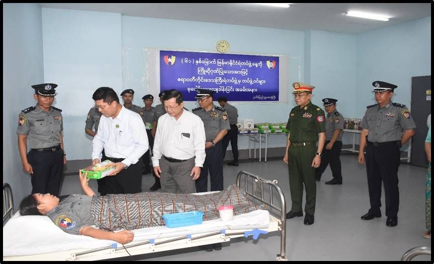 ဦးစွာ တိုင်းဒေသကြီးဝန်ကြီးချုပ်၊ တိုင်းမှူးနှင့် တာဝန်ရှိသူများက မြန်မာနိုင်ငံရဲတပ်ဖွဲ့ဝင်များ၏ စုပေါင်းသွေးလှူဒါန်းနေမှုကို လိုက်လံကြည့်ရှု့အားပေးကြပြီး သွေးအလှူရှင်များအတွက် အာဟာရဖြည့်စားသောက်ဖွယ်ရာများနှင့် အားဆေးများပေးအပ်သည်။ အဆိုပါသွေးလှူဒါန်းပွဲတွင် မြန်မာနိုင်ငံရဲတပ်ဖွဲ့ဝင် ၆၁ ဦး သွေးလှူဒါန်းခဲ့ကြကြောင်း သတင်းရရှိသည်။
