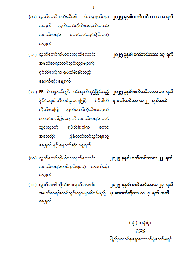 လွှတ်တော်အသီးသီး၏ မဲဆန္ဒနယ်များအတွက် လွှတ်တော်ကိုယ်စားလှယ်လောင်းများ အမည်စာရင်းတင်သွင်းခြင်း၊ စိစစ်ခြင်း၊ ရုပ်သိမ်းခြင်းတို့နှင့် စပ်လျဉ်းသည့် နေ့ရက်များ ပြင်ဆင်သတ်မှတ်ကြေညာခြင်း