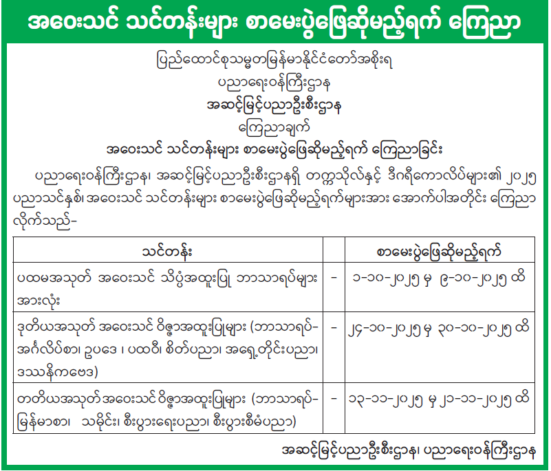အဝေးသင် သင်တန်းများ စာမေးပွဲဖြေဆိုမည့်ရက် ကြေညာခြင်း