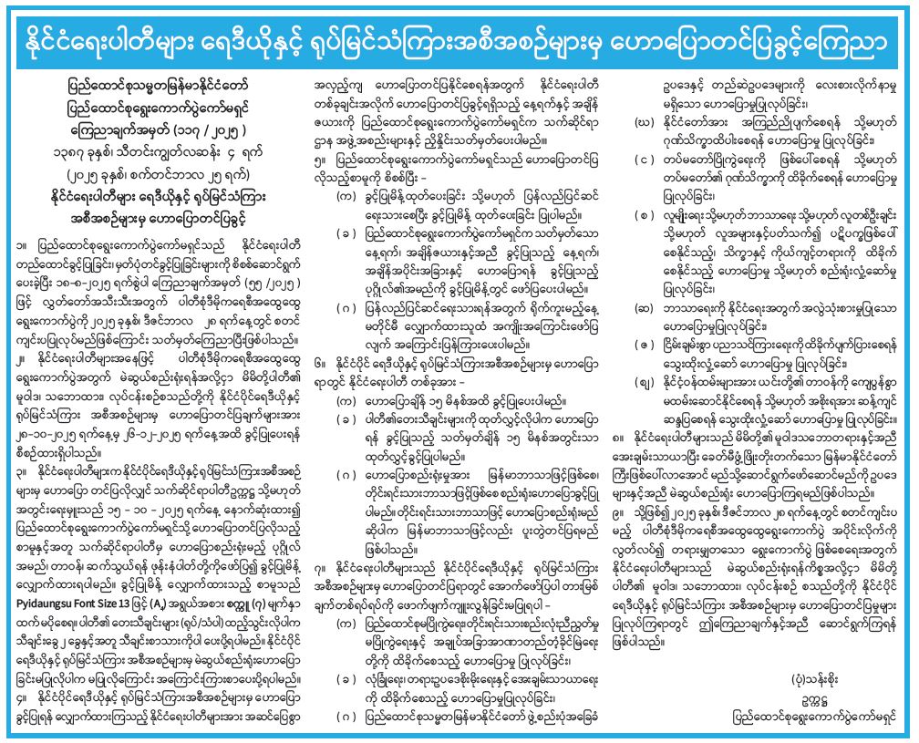 နိုင်ငံရေးပါတီများ ရေဒီယိုနှင့် ရုပ်မြင်သံကြားအစီအစဉ်များမှ ဟောပြောတင်ပြခွင့်ကြေညာ