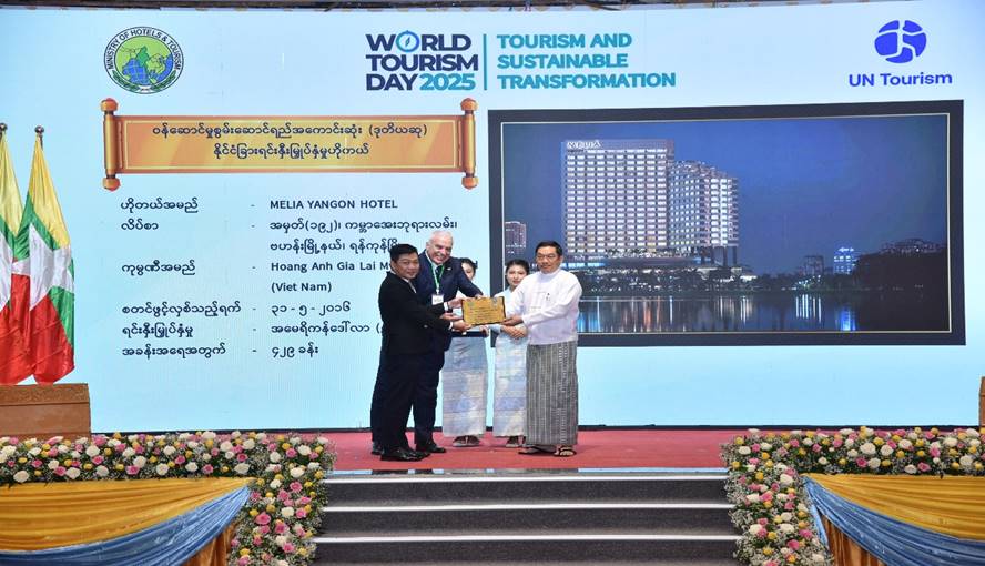 ယင်းနောက် UN Tourism အထွေထွေအတွင်းရေးမှူးချုပ် Mr. Zurab Pololikashvili ၏ သတင်းစကားရုပ်သံ video clip နှင့် မြန်မာနိုင်ငံတွင် ဆောင်ရွက်လျက်ရှိသော ခရီးသွားလုပ်ငန်း အမျိုးအစားများအကြောင်း Video Clip ကို ပြသသည်။ ထို့နောက် နိုင်ငံတော်ဝန်ကြီးချုပ် ဦးညိုစောက ဝန်ဆောင်မှုစွမ်းဆောင်ရည်အကောင်းဆုံးဆုရရှိသော နိုင်ငံခြားရင်းနှီးမြှုပ်နှံမှု ဟိုတယ်များနှင့် ဖက်စပ်ဟိုတယ်များ၊ ၂၀၂၅ ခုနှစ်၊ ကမ္ဘာ့ခရီးသွားလုပ်ငန်းနေ့အထိမ်းအမှတ် စာတမ်းဖတ်ပြိုင်ပွဲနှင့် ရောင်စုံဓာတ်ပုံပြိုင်ပွဲများတွင် ဆုရရှိကြသူများအား ဂုဏ်ပြုဆုနှင့် ဂုဏ်ပြုမှတ်တမ်းလွှာများ ပေးအပ်ချီးမြှင့်သည်။