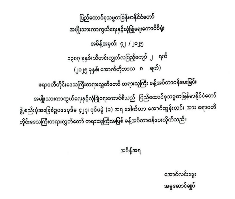 ဧရာဝတီတိုင်းဒေသကြီးတရားလွှတ်တော် တရားသူကြီး ခန့်အပ်တာဝန်ပေးခြင်း