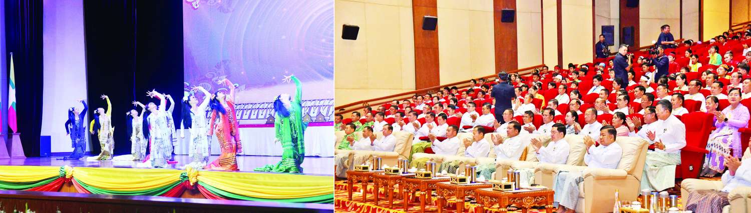 ဦးစွာ သာသနာရေးနှင့်ယဉ်ကျေးမှုဝန်ကြီးဌာန အနုပညာဦးစီးဌာနမှ အနုပညာရှင်များက “ကျောက်မျက်စီခြယ် နဝရတ်ကိုးသွယ်” ယိမ်းအကဖြင့် ကပြဖျော်ဖြေတင်ဆက်သည်။