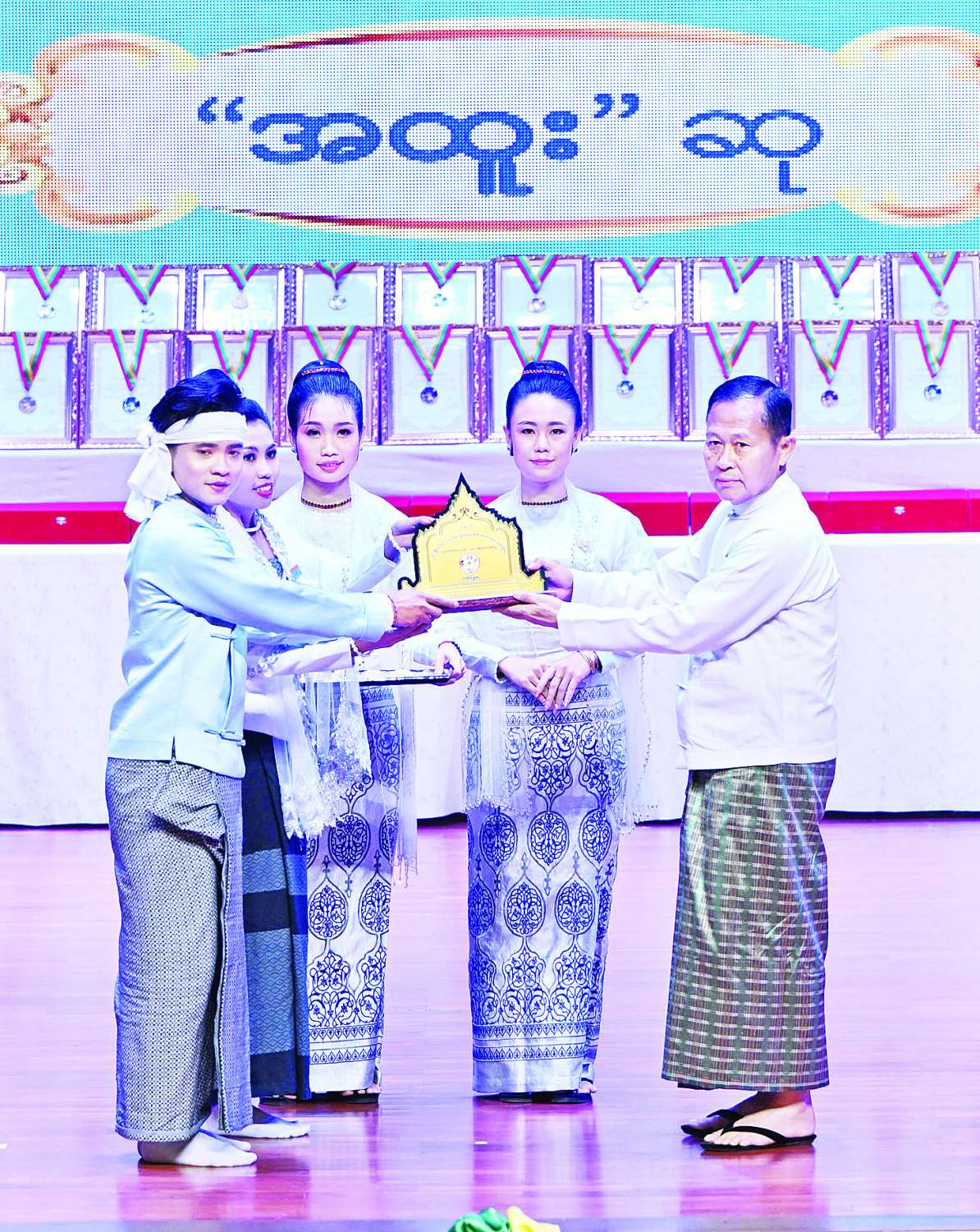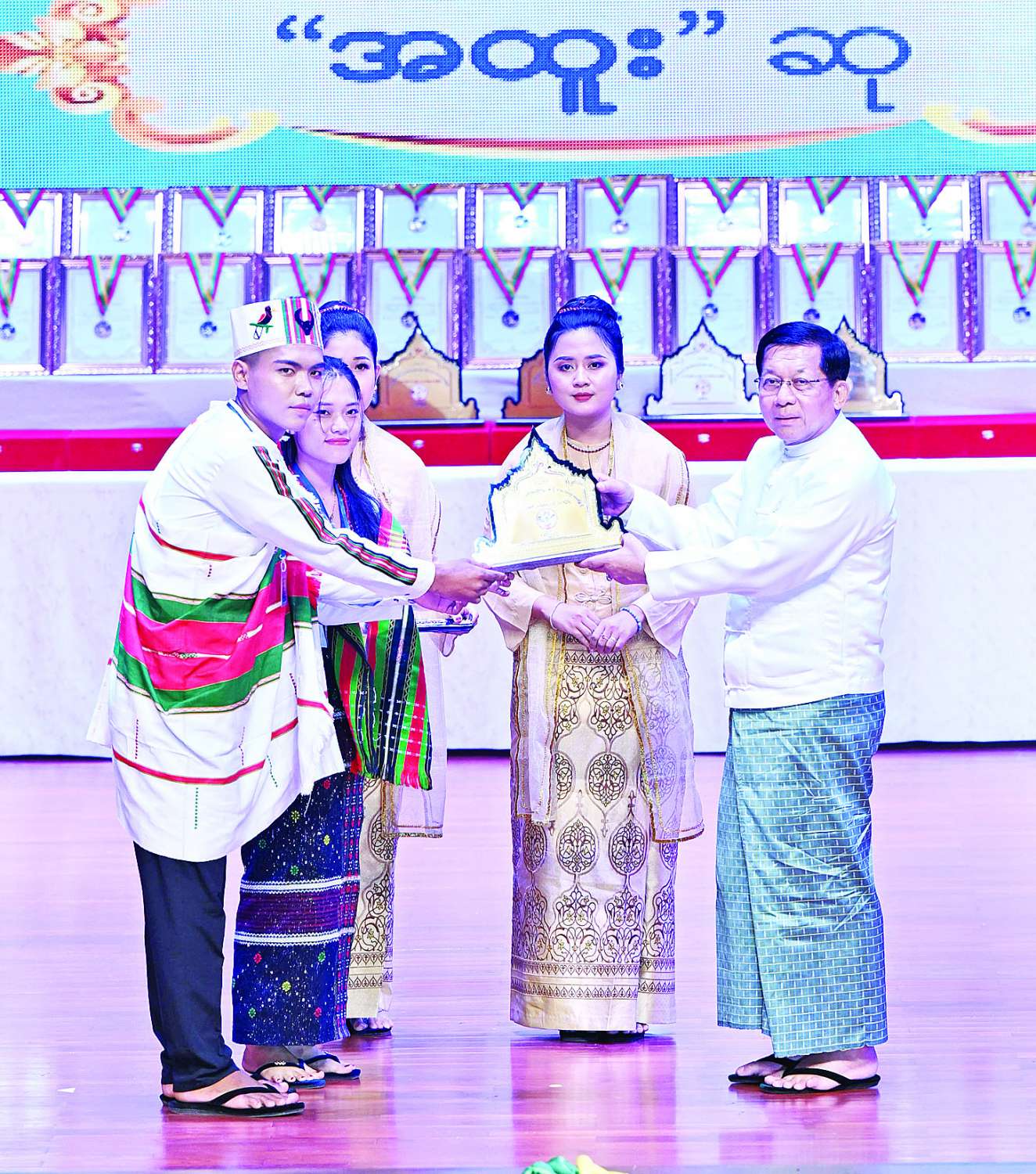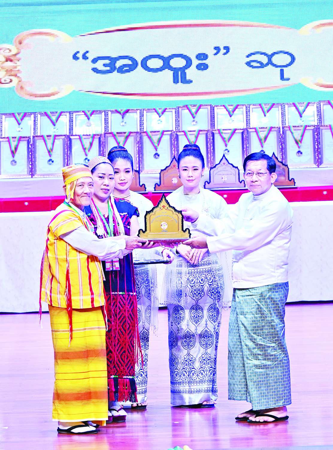 ယင်းနောက် ဂုဏ်ပြုဆုများပေးအပ်ချီးမြှင့်ရာ နိုင်ငံတော်ယာယီသမ္မတ နိုင်ငံတော်လုံခြုံရေးနှင့် အေးချမ်းသာယာရေးကော်မရှင်ဥက္ကဋ္ဌက ကချင်ပြည်နယ်၊ ကယားပြည်နယ်၊ ကရင်ပြည်နယ်၊ ချင်းပြည်နယ်၊ စစ်ကိုင်းတိုင်းဒေသကြီး၊ တနင်္သာရီတိုင်းဒေသကြီး၊ ပဲခူးတိုင်းဒေသကြီး၊ မကွေးတိုင်းဒေသကြီး၊ မန္တလေးတိုင်းဒေသကြီး၊ မွန်ပြည်နယ်၊ ရခိုင်ပြည်နယ်၊ ရန်ကုန်တိုင်းဒေသကြီး၊ ရှမ်းပြည်နယ်နှင့် ဧရာဝတီတိုင်းဒေသကြီးတို့မှ တိုင်းရင်းသားရိုးရာ/ ကျေးလက်ရိုးရာ ယဉ်ကျေးမှုအဖွဲ့များကို ဂုဏ်ပြုဆုများ ပေးအပ်ချီးမြှင့်သည်။
