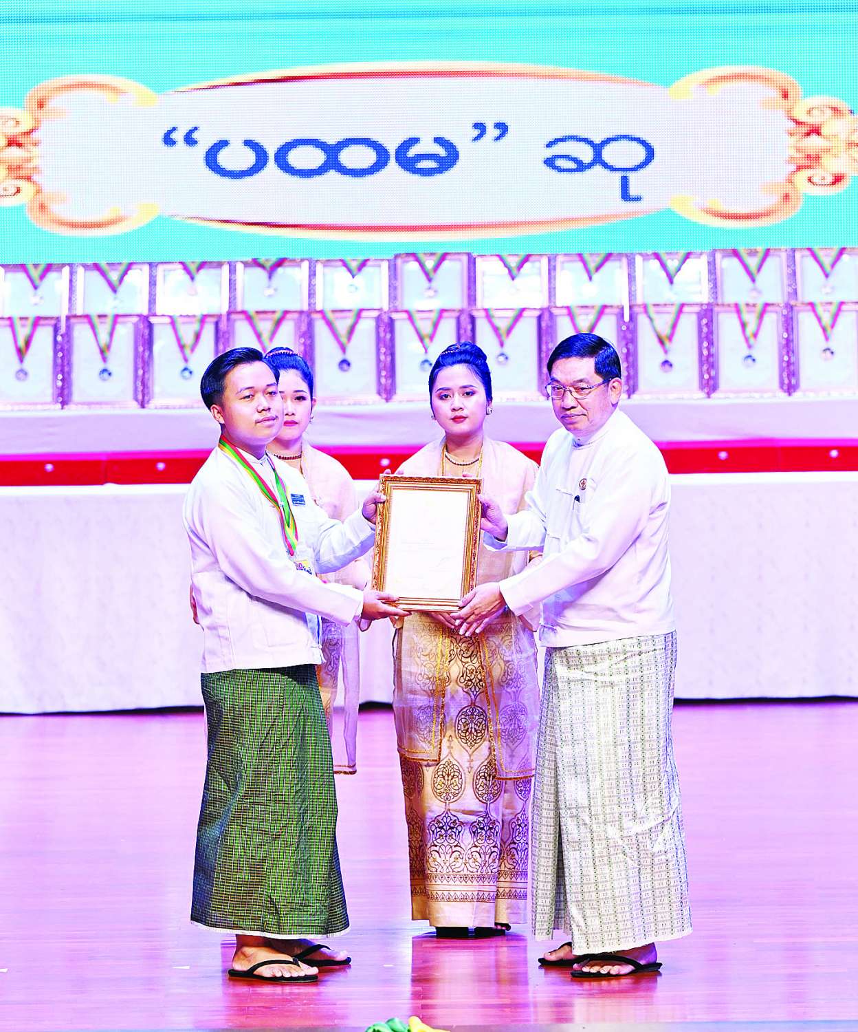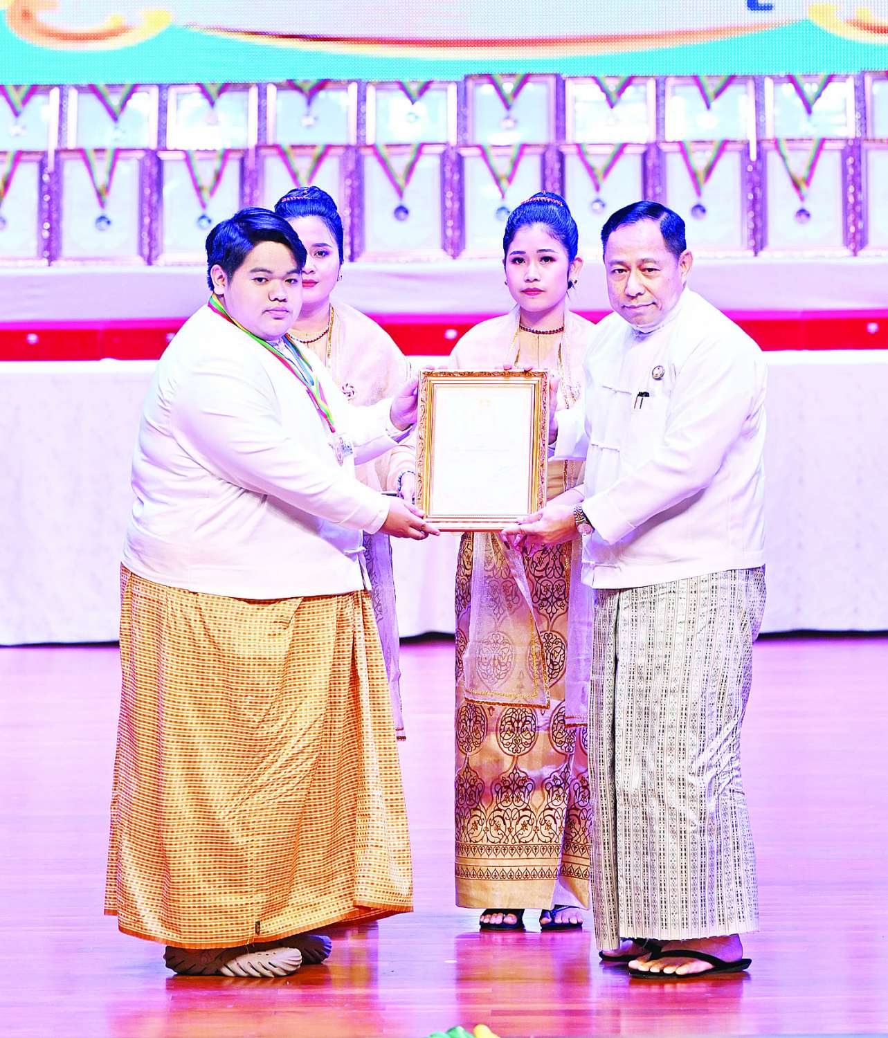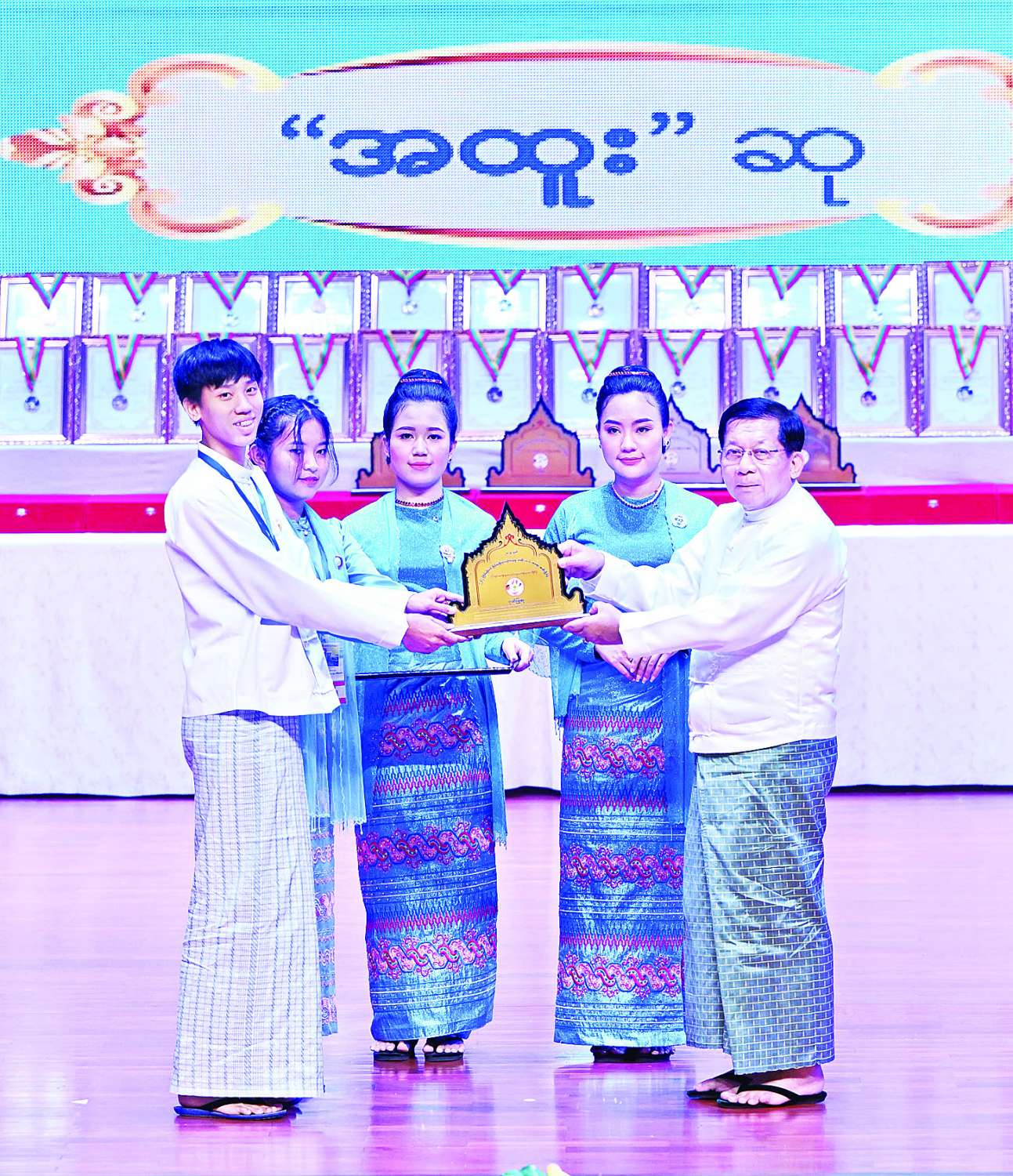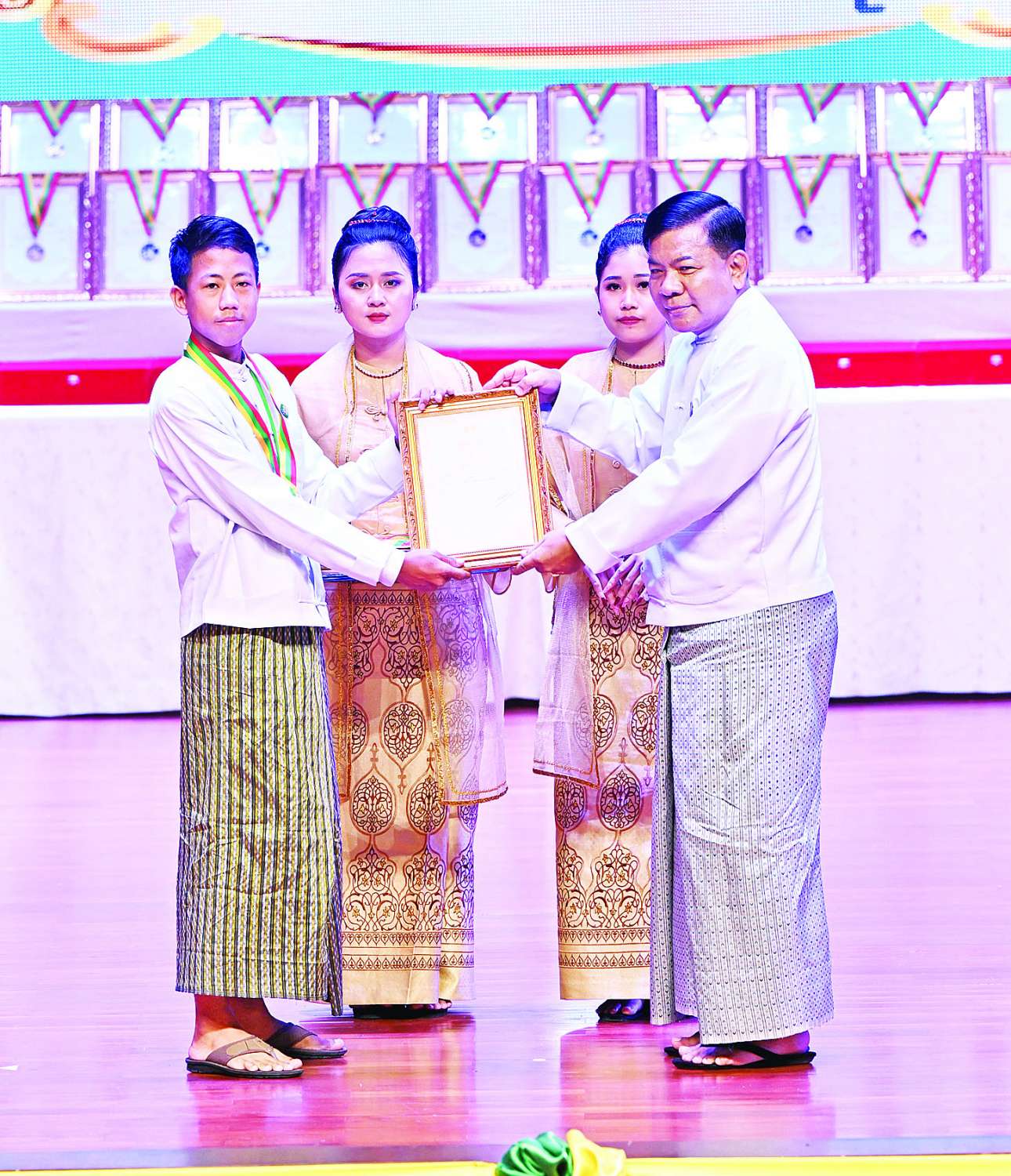 ယင်းနောက် ဂုဏ်ပြုဆုများပေးအပ်ချီးမြှင့်ရာ နိုင်ငံတော်ယာယီသမ္မတ နိုင်ငံတော်လုံခြုံရေးနှင့် အေးချမ်းသာယာရေးကော်မရှင်ဥက္ကဋ္ဌက ကချင်ပြည်နယ်၊ ကယားပြည်နယ်၊ ကရင်ပြည်နယ်၊ ချင်းပြည်နယ်၊ စစ်ကိုင်းတိုင်းဒေသကြီး၊ တနင်္သာရီတိုင်းဒေသကြီး၊ ပဲခူးတိုင်းဒေသကြီး၊ မကွေးတိုင်းဒေသကြီး၊ မန္တလေးတိုင်းဒေသကြီး၊ မွန်ပြည်နယ်၊ ရခိုင်ပြည်နယ်၊ ရန်ကုန်တိုင်းဒေသကြီး၊ ရှမ်းပြည်နယ်နှင့် ဧရာဝတီတိုင်းဒေသကြီးတို့မှ တိုင်းရင်းသားရိုးရာ/ ကျေးလက်ရိုးရာ ယဉ်ကျေးမှုအဖွဲ့များကို ဂုဏ်ပြုဆုများ ပေးအပ်ချီးမြှင့်သည်။