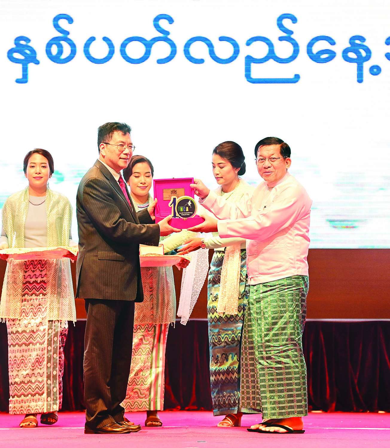 ပြည်ထောင်စုသမ္မတမြန်မာနိုင်ငံတော် ယာယီသမ္မတ နိုင်ငံတော်လုံခြုံရေးနှင့်အေးချမ်းသာယာရေးကော်မရှင် ဥက္ကဋ္ဌ အမျိုးသားစည်းလုံးညီညွတ်ရေးနှင့် ငြိမ်းချမ်းရေးဖော်ဆောင်မှု ဗဟိုကော်မတီ ဥက္ကဋ္ဌ တပ်မတော်ကာကွယ်ရေးဦးစီးချုပ် ဗိုလ်ချုပ်မှူးကြီး မင်းအောင်လှိုင် တစ်နိုင်ငံလုံး ပစ်ခတ်တိုက်ခိုက်မှုရပ်စဲရေး သဘောတူစာချုပ်(NCA) (၁၀)နှစ်ပြည့် နှစ်ပတ်လည်နေ့ အခမ်းအနားသို့ တက်ရောက်မိန့်ခွန်းပြောကြား