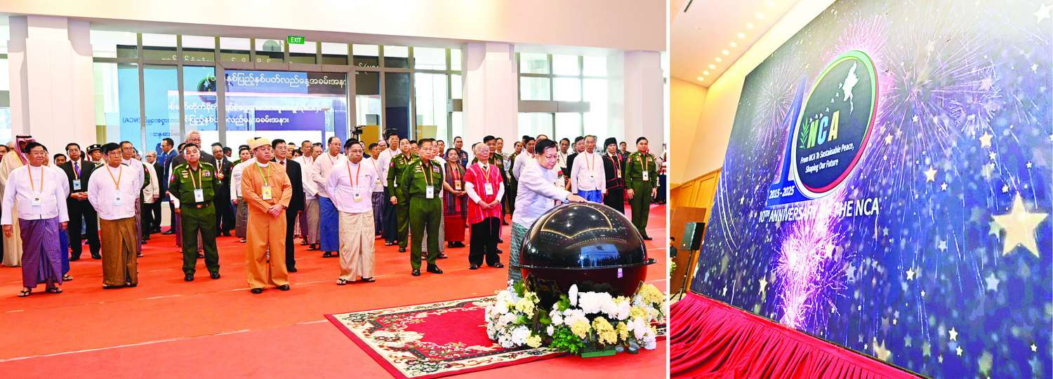 ထို့နောက် နိုင်ငံတော်ယာယီသမ္မတ နိုင်ငံတော်လုံခြုံရေးနှင့်အေးချမ်းသာယာရေးကော်မရှင် ဥက္ကဋ္ဌ အမျိုးသားစည်းလုံးညီညွတ်ရေးနှင့် ငြိမ်းချမ်းရေးဖော်ဆောင်မှု ဗဟိုကော်မတီ ဥက္ကဋ္ဌ ဗိုလ်ချုပ်မှူးကြီး မင်းအောင်လှိုင် က တစ်နိုင်ငံလုံး ပစ်ခတ်တိုက်ခိုက်မှုရပ်စဲရေး သဘောတူစာချုပ်(NCA) (၁၀)နှစ်ပြည့်နှစ်ပတ်လည်နေ့  အခမ်းအနားဆိုင်းဘုတ်ကို စက်ခလုတ်နှိပ်၍ ဖွင့်လှစ်ပေးသည်။