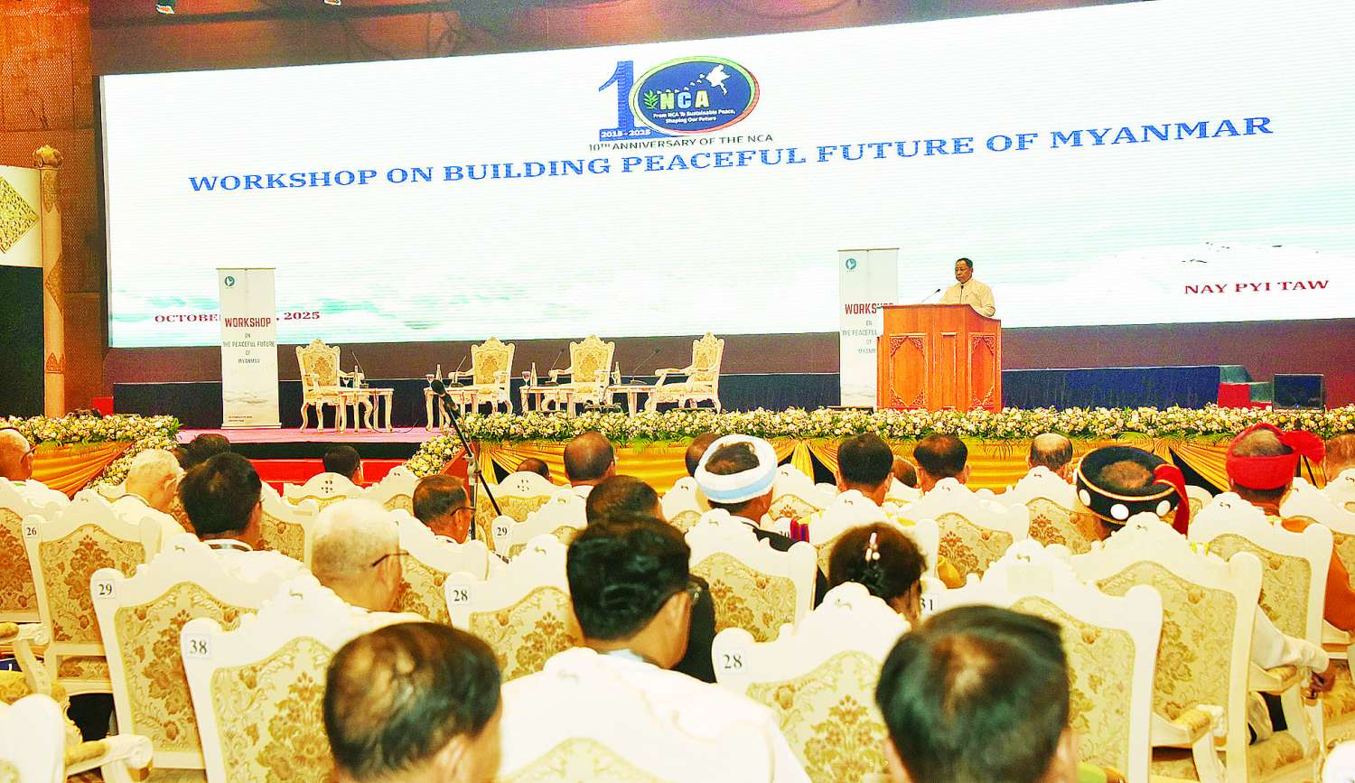 တစ်နိုင်ငံလုံး ပစ်ခတ်တိုက်ခိုက်မှုရပ်စဲရေး သဘောတူစာချုပ် (NCA) (၁၀)နှစ်ပြည့် နှစ်ပတ်လည်နေ့အထိမ်းအမှတ် “ငြိမ်းချမ်းသော မြန်မာ့အနာဂတ် တည်ဆောက်ခြင်း” အလုပ်ရုံဆွေးနွေးပွဲကို ယနေ့ မွန်းလွဲပိုင်းတွင် နေပြည်တော်ရှိ မြန်မာအပြည်ပြည်ဆိုင်ရာ ကွန်ဗင်းရှင်းဗဟိုဌာန(၁) ကျောက်စိမ်းခန်းမ၌ ကျင်းပသည်။
