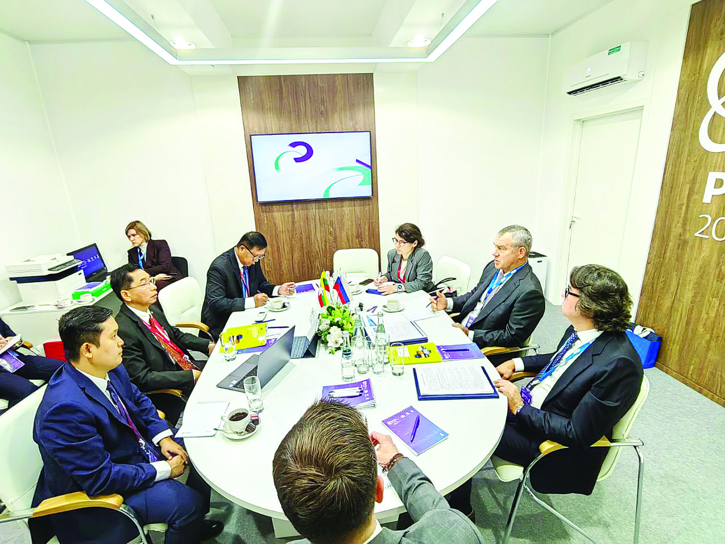ထို့နောက် ပြည်ထောင်စုဝန်ကြီးနှင့်အဖွဲ့သည် ဖိုရမ်တက်ရောက်နေစဉ်အတွင်း စွမ်းအင်ကဏ္ဍတွင် ပါဝင်ဆောင်ရွက်လျက်ရှိသည့် အဖွဲ့အစည်းအသီးသီး မှ ခင်းကျင်းပြသထားသည့် ပြခန်းများကို လေ့လာကြည့်ရှုကြပြီး Joint Stock Company Inter RAO ပြခန်းတွင် သဘာဝဓာတ်ငွေ့ကို လေလွင့်ဆုံးရှုံးမှု အနည်းဆုံးအသုံးပြု၍ လျှပ်စစ်ထုတ်လုပ်နိုင်သည့် Combined-cycle Gas Turbine များ၏ စွမ်းဆောင် ရည်များနှင့်စပ်လျဉ်း၍ တာဝန်ရှိသူများနှင့် မေးမြန်းဆွေးနွေးခဲ့သည်။
