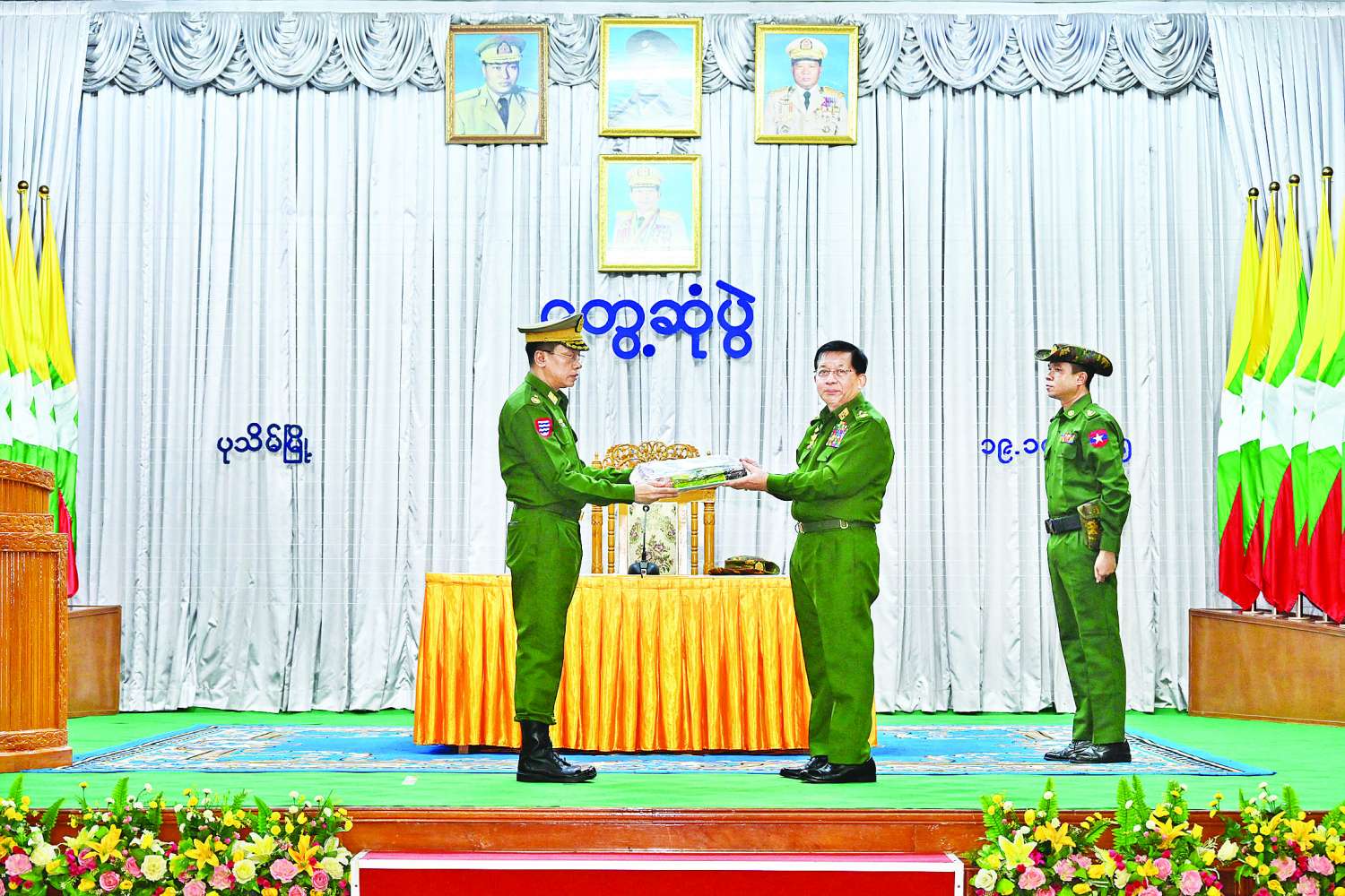 ထို့နောက် နိုင်ငံတော်လုံခြုံရေးနှင့် အေးချမ်းသာယာရေးကော်မရှင်ဥက္ကဋ္ဌ တပ်မတော်ကာကွယ်ရေးဦးစီးချုပ်က တပ်နယ်မှ အရာရှိ၊ စစ်သည်၊ မိသားစုများအတွက် စားသောက်ဖွယ်ရာများကိုပေးအပ်ရာ တိုင်းမှူးကလည်းကောင်း၊ နိုင်ငံတော်လုံခြုံရေးနှင့် အေးချမ်းသာယာရေးကော်မရှင်ဥက္ကဋ္ဌ တပ်မတော်ကာကွယ်ရေးဦးစီးချုပ်၏ဇနီးက တပ်နယ်မိခင်နှင့်ကလေးစောင့်ရှောက်ရေးအသင်းအတွက် ချီးမြှင့်ငွေများကို ပေးအပ်ရာတိုင်းမှူး၏ ဇနီးကလည်းကောင်း အသီးသီးလက်ခံရယူကြသည်။