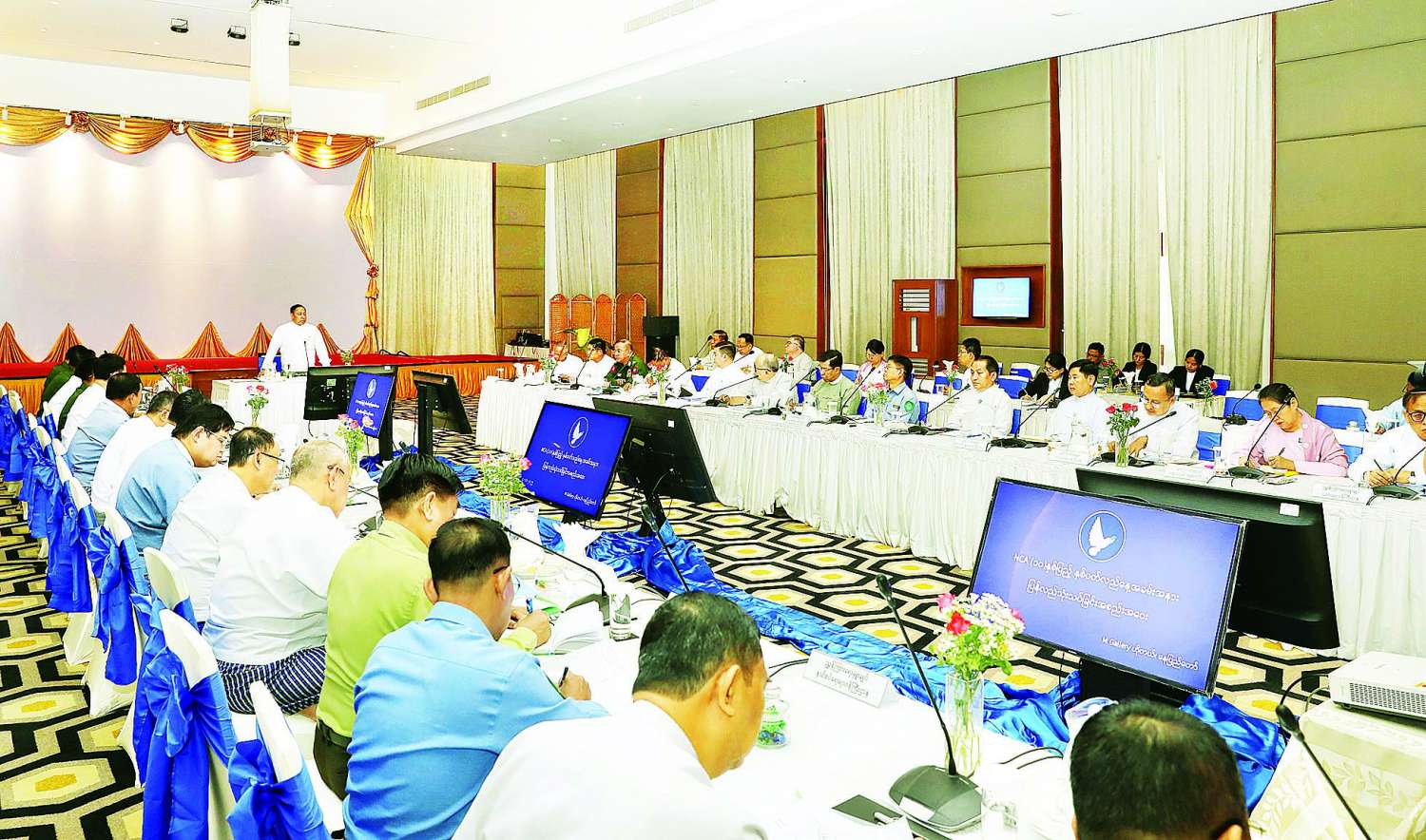အစည်းအဝေးသို့ NCA (၁၀)နှစ်ပြည့် နှစ်ပတ်လည်နေ့အခမ်းအနားကျင်းပရေး ဦးစီးကော်မတီဥက္ကဋ္ဌ ပြည်ထောင်စုဝန်ကြီး ဒုတိယဗိုလ်ချုပ်ကြီးရာပြည့်၊ အမျိုးသားစည်းလုံးညီညွတ်ရေးနှင့် ငြိမ်းချမ်းရေးဖော်ဆောင်မှုညှိနှိုင်းရေးကော်မတီအတွင်းရေးမှူး ဒုတိယဗိုလ်ချုပ်ကြီး မင်းနိုင်နှင့် ကော်မတီဝင်များ၊ ဦးစီးကော်မတီအဖွဲ့ဝင်များဖြစ်ကြသည့် ပြည်ထောင်စုဝန်ကြီးဌာနများမှဒုတိယဝန်ကြီးများနှင့် တာဝန်ရှိသူများ တက်ရောက်ကြသည်။