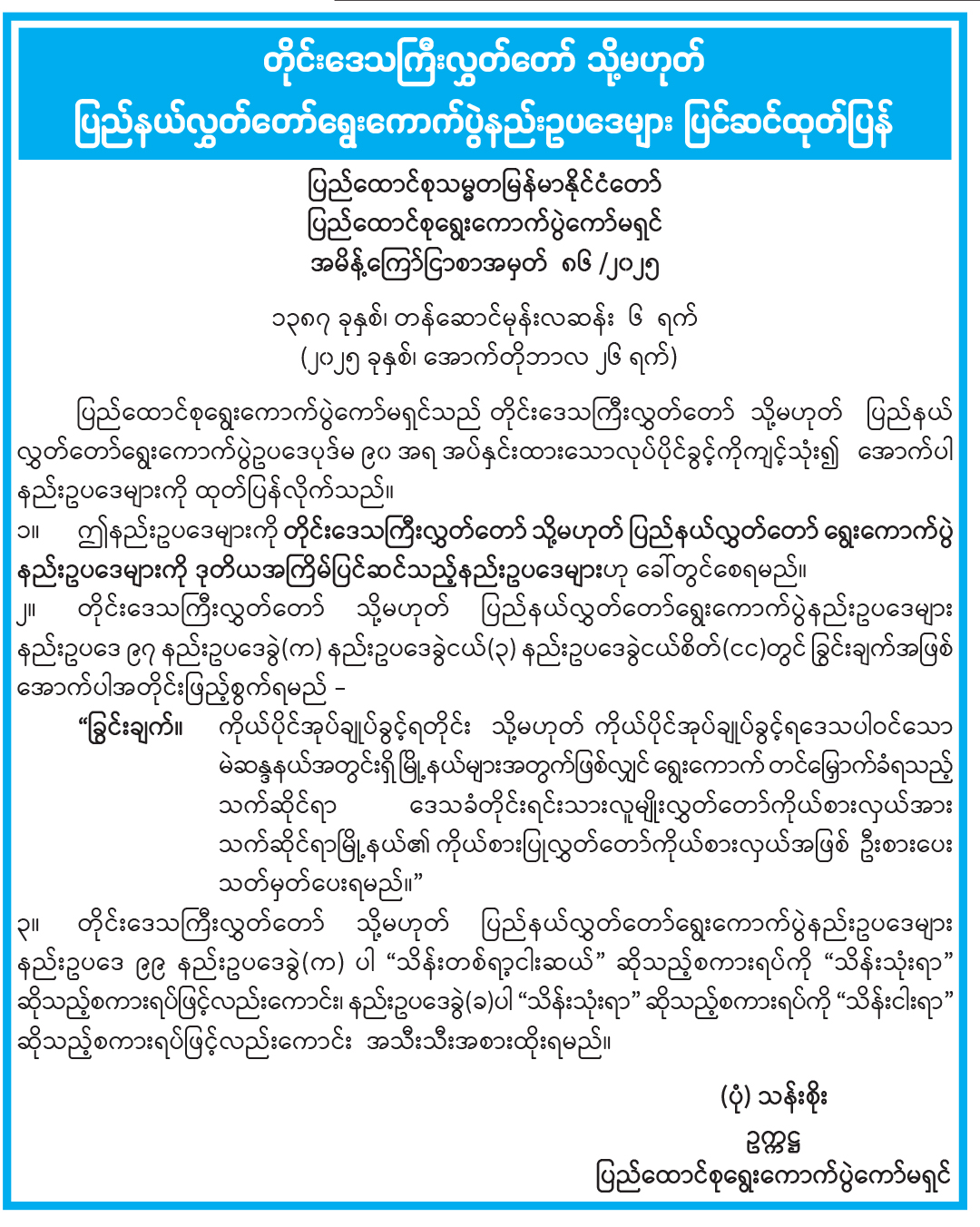 တိုင်းဒေသကြီးလွှတ်တော် သို့မဟုတ် ပြည်နယ်လွှတ်တော်ရွေးကောက်ပွဲနည်းဥပဒေများ ပြင်ဆင်ထုတ်ပြန်