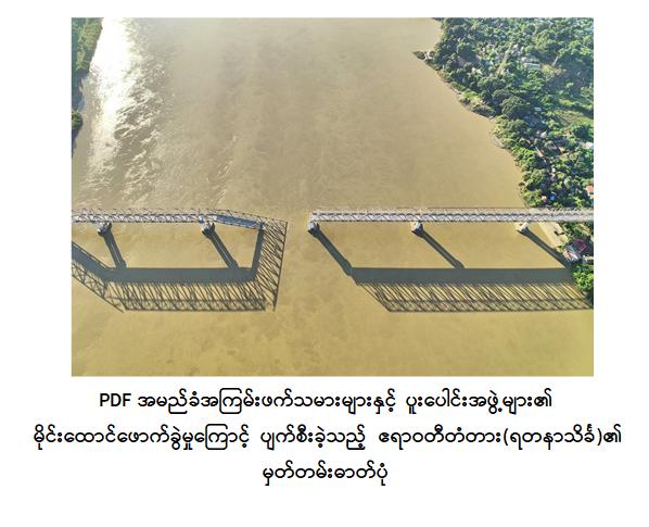 မန္တလေးတိုင်းဒေသကြီး စဉ့်ကူးမြို့နှင့် စစ်ကိုင်းတိုင်းဒေသကြီး ကျောက်မြောင်းမြို့သို့ဆက်သွယ်ထားသည့် ဧရာဝတီတံတား(ရတနာသိင်္ခ)အား PDF အမည်ခံအကြမ်းဖက်သမားများနှင့်ပူးပေါင်းအဖွဲ့များက မိုင်းထောင်ဖောက်ခွဲဖျက်ဆီး