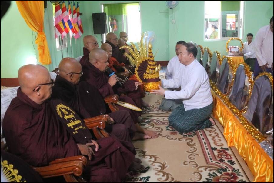 ဦးစွာ တိုင်းဒေသကြီးနှင့် ပြည်နယ်ဝန်ကြီးချုပ်များ၊ ကာကွယ်ရေးဦးစီးချုပ်ရုံး(ကြည်း)မှ တပ်မတော်အရာရှိကြီးများ၊ တိုင်းမှူးများနှင့် တက်ရောက်လာကြသူများက ဆရာတော်အရှင်သူမြတ်များထံမှ သီလခံယူဆောက်တည်ကြပြီး သံဃာတော်များ ရွတ်ပွားချီးမြှင့်တော်မူသည့် ပရိတ်တရားတော်များကို နာယူကြသည်။ ထို့နောက် တိုင်းဒေသကြီးနှင့် ပြည်နယ်ဝန်ကြီးချုပ်များ၊ ကာကွယ်ရေးဦးစီးချုပ်ရုံး(ကြည်း)မှ တပ်မတော်အရာရှိကြီးများ၊ တိုင်းမှူးများနှင့် တက်ရောက်လာကြသူများက သံဃာတော်များအား ကထိန်လျာသင်္ကန်းနှင့် လှူဖွယ်ပစ္စည်းများ အသီးသီးဆက်ကပ်လှူဒါန်းကြသည်။