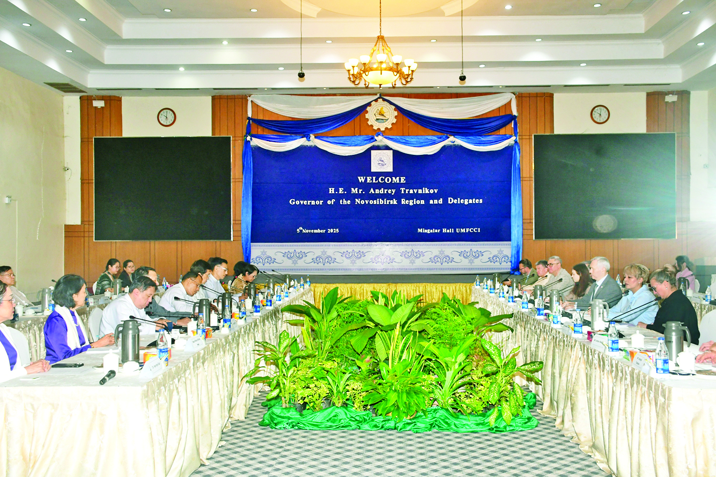 ဆက်လက်၍ ပြည်ထောင်စုသမ္မတ မြန်မာနိုင်ငံကုန်သည်များနှင့်စက်မှုလက်မှုလုပ်ငန်းရှင်များအသင်းချုပ်ရုံးမင်္ဂလာခန်းမ၌ မြန်မာနိုင်ငံကုန်သည်များနှင့်စက်မှုလက်မှုလုပ်ငန်းရှင်များအသင်းချုပ်ဥက္ကဋ္ဌ ဦးအေးဝင်း၊ အထွေထွေအတွင်းရေးမှူးနှင့်အမှုဆောင်အဖွဲ့ဝင်များနှင့်တွေ့ဆုံပြီး စီးပွားရေးဆိုင်ရာများနှင့် ရင်းနှီးမြှုပ်နှံမှုဆိုင်ရာကိစ္စရပ်များကို ဆွေးနွေးကြသည်။