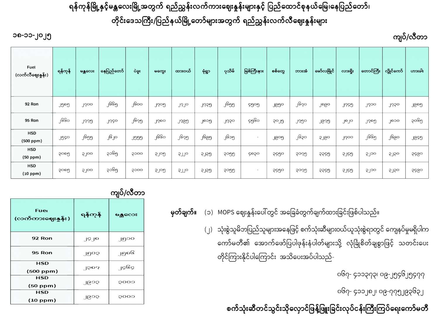 ရန်ကုန်မြို့နှင့် မန္တလေးမြို့အတွက် ရည်ညွှန်းလက်ကားဈေးနှုန်းများနှင့် ပြည်ထောင်စုနယ်မြေ နေပြည်တော်၊ တိုင်းဒေသကြီး/ ပြည်နယ် မြို့တော်များအတွက် ရည်ညွှန်းလက်လီဈေးနှုန်းများ 11/18/2025