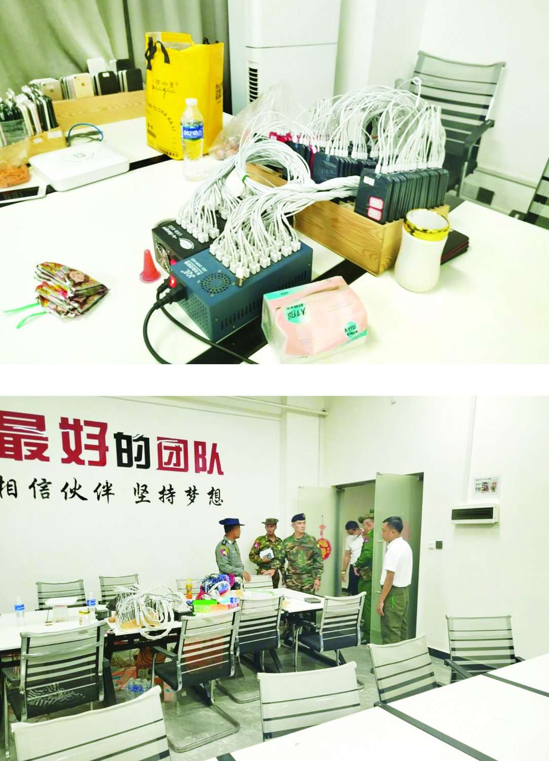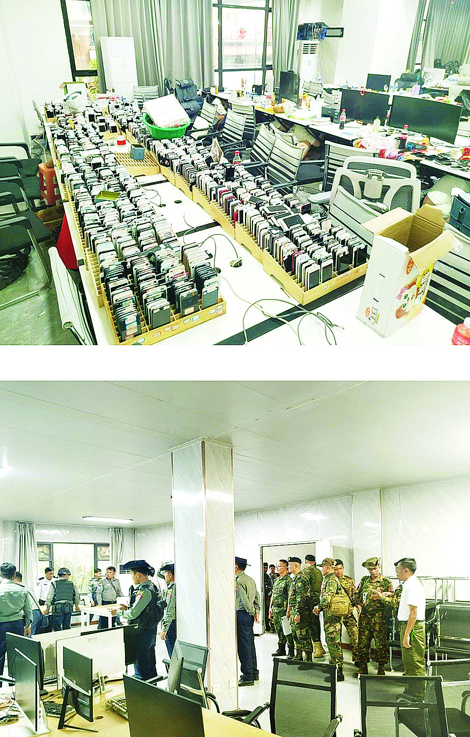 ယနေ့ ရွှေကုက္ကိုလ်နယ်မြေအတွင်း ရှင်းလင်းဖော်ထုတ်မှုများ ဆောင်ရွက်စဉ် ခွင့်ပြုချက်မရှိဘဲ ဆောက်လုပ်ထားသည့် အဆောက်အဦ ၃ ခုအတွင်းမှ မြန်မာနိုင်ငံအတွင်းသို့ တရားမဝင် ဝင်ရောက်နေထိုင်လျက်ရှိသည့် စိစစ်ဆဲ နိုင်ငံခြားသား ၃၄၆ ဦးနှင့် Online လိမ်လည်လောင်းကစားမှုများကျူးလွန်ရာတွင် အသုံးပြုသည့် လုပ်ငန်းသုံးပစ္စည်းအများ အပြားကိုလည်း စိစစ်တွေ့ရှိဖမ်းဆီးရရှိခဲ့ပြီး ဆက်လက်ရှင်းလင်းခြင်းများ ဆောင်ရွက်လျက်ရှိကြောင်း သိရှိရသည်။