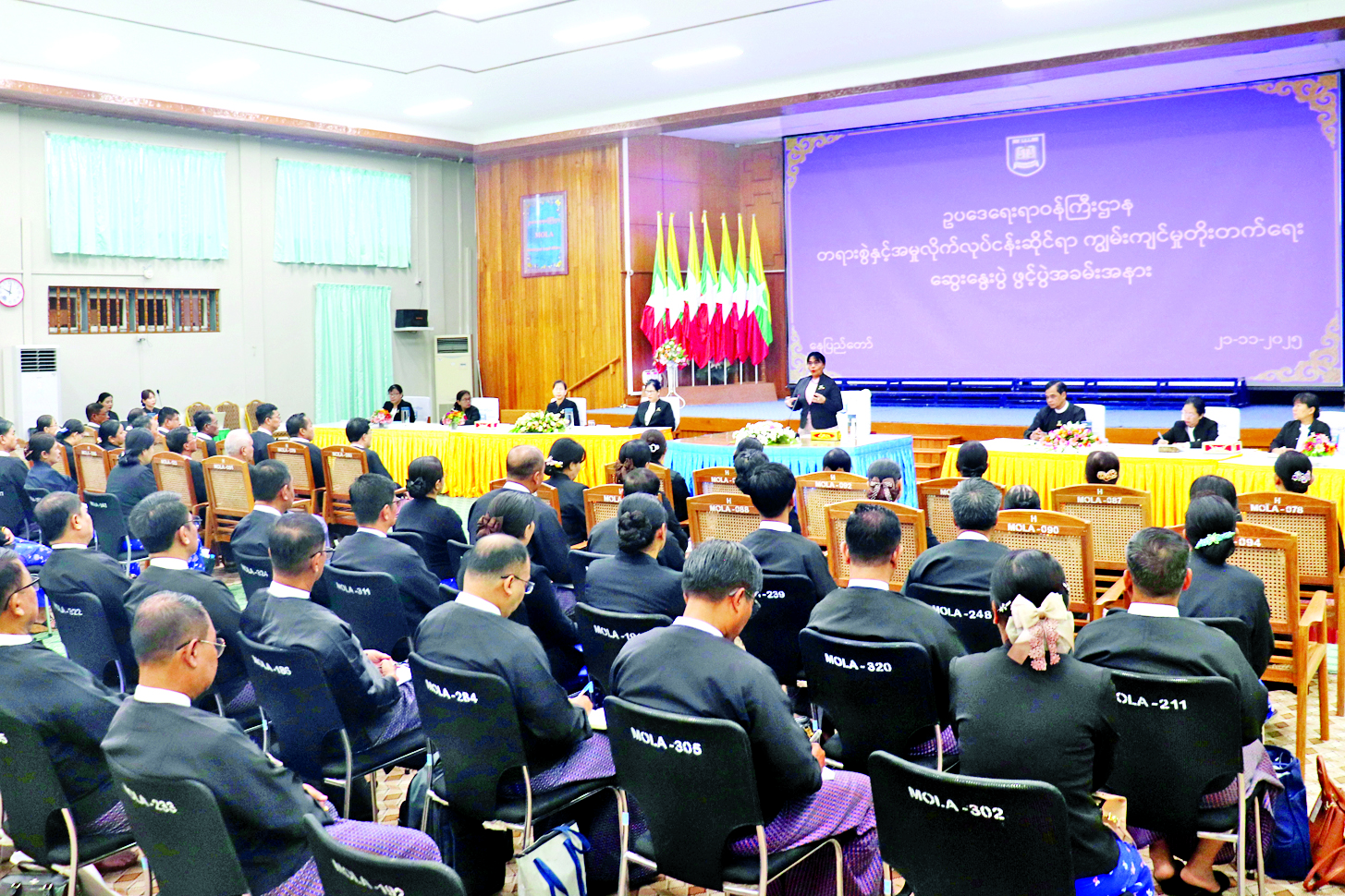 အဓိကအနေဖြင့် ဥပဒေရေးရာဝန်ကြီးဌာနက ကိုင်တွယ်ကျင့်သုံးလျက်ရှိသည့် ပြည်ထောင်စုရှေ့နေချုပ်ဥပဒေ၊ နည်းဥပဒေ၊ အမိန့်၊ ညွှန်ကြားချက်များအားအမှုကို စတင်ကိုင်တွယ်ဆောင်ရွက်ရသည့် မြို့နယ်ဥပဒေအရာရှိ၊ ဒုတိယမြို့နယ်ဥပဒေအရာရှိများအနေဖြင့် သိရှိကျွမ်းကျင်နှံ့စပ်ရန် လိုအပ်သကဲ့သို့ ၎င်းတို့အား ကြီးကြပ်ဆောင်ရွက်နေရသည့် ခရိုင်ဥပဒေအရာရှိများ၊ ဒုတိယခရိုင်ဥပဒေအရာရှိများအနေဖြင့်လည်း ကျွမ်းကျင်နှံ့စပ်ရန် လိုအပ်ကြောင်း၊ ဥပဒေအရာရှိများအနေဖြင့် ဆောင်ရွက်လျက်ရှိသည့် လုပ်ငန်းများတွင် မှားယွင်းမှုများတွေ့ရှိရသည့်အတွက် ယခုဆွေးနွေးပွဲတွင် ဆွေးနွေးပြီး တစ်ပြေးညီ မူဝါဒများချမှတ်၍ လိုက်နာကျင့်သုံးရန်နှင့် မိမိလက်အောက်အဆင့်ဆင့်သို့ ပြန်လည်မျှဝေရန်ဖြစ်ကြောင်း၊ ပြည်ထောင်စုရှေ့နေချုပ်နည်းဥပဒေများကို ပြင်ဆင်ရန်ရှိသဖြင့် ယခုဆွေးနွေးပွဲ၌ ပြင်ဆင်သင့်သည့် အချက်များအား ဆွေးနွေးကြစေလိုကြောင်း၊ ရွေးကောက်ပွဲနီးပြီဖြစ်သဖြင့် တိုင်းဒေသကြီး ဥပဒေအရာရှိ၊ ခရိုင်ဥပဒေအရာရှိများအနေဖြင့် သက်ဆိုင်ရာတာဝန်များကို အထူးအလေးထားဆောင်ရွက်ရန် လိုအပ်ကြောင်းပြောကြားသည်။