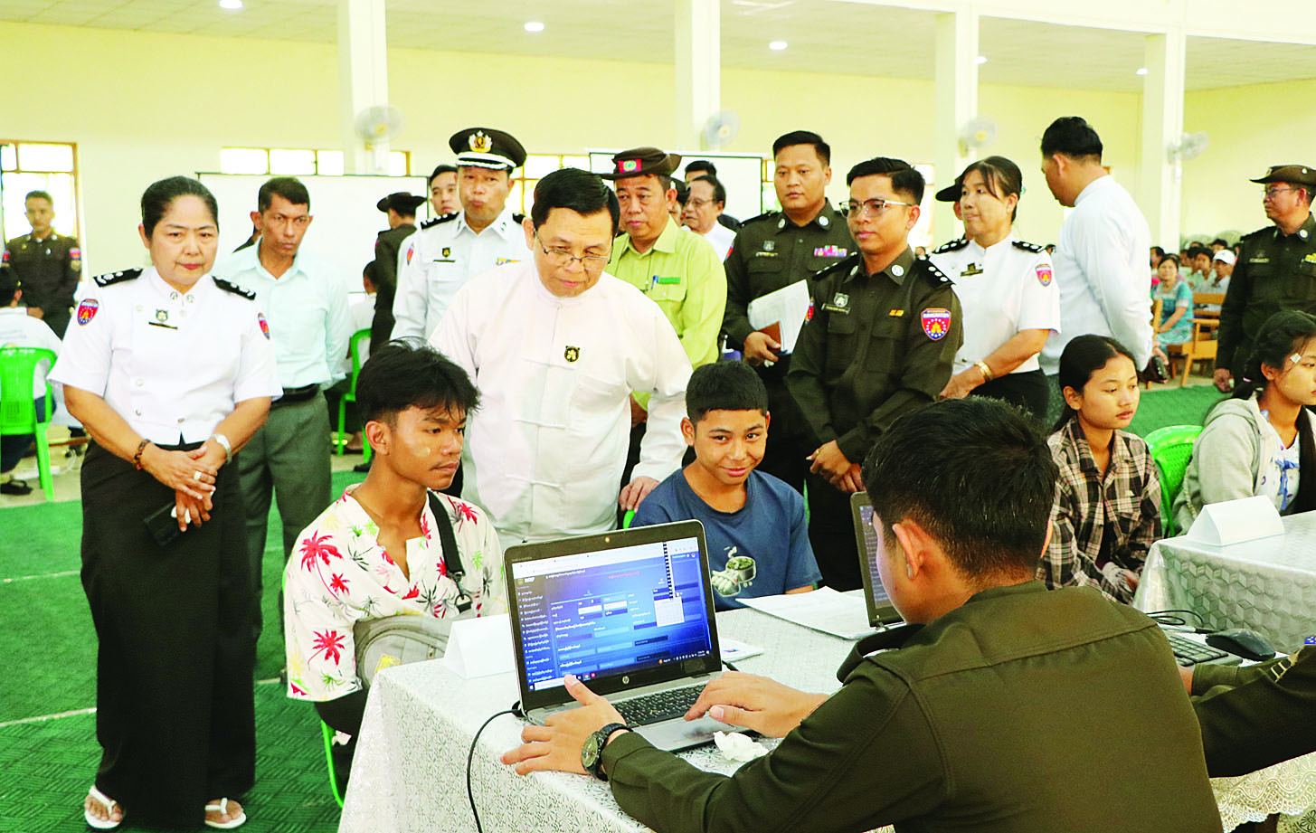ဦးစွာ ပြည်ထောင်စုဝန်ကြီးသည် အိမ်ထောင်စုလူဦးရေစာရင်းနှင့် နိုင်ငံသားစိစစ်ရေးကတ် လာရောက်ဆောင်ရွက်ကြသည့် ဒေသခံပြည်သူများအား လုပ်ငန်းဆိုင်ရာအခက်အခဲများ မေးမြန်းဆွေးနွေးပြီး ဝန်ထမ်းများက ပန်းခင်းစီမံချက်အဆင့် (၃) ဖြင့် အိမ်ထောင်စုလူဦးရေစာရင်းနှင့် နိုင်ငံသားစိစစ်ရေးကတ်ထုတ်ပေးနိုင်ရေး One Stop Service ဖြင့် ဆောင်ရွက်နေမှုနှင့် နိုင်ငံသားစိစစ်ရေးကတ်ရရှိပြီးသူများအား e-ID စနစ်ဖြင့် Biographic/ Biometric ကောက်ယူကာ Unique ID နံပါတ်ထုတ်ပေးနေမှုကို ကြည့်ရှုအားပေးသည်။