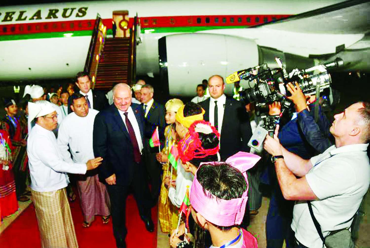 လေဆိပ်သို့ရောက်ရှိစဉ် ဘယ်လာရုစ်သမ္မတနိုင်ငံ သမ္မတဦးဆောင်သည့် အဆင့်မြင့်ကိုယ်စားလှယ်အဖွဲ့အား နိုင်ငံတော်လုံခြုံရေးနှင့်အေးချမ်းသာယာရေး ကော်မရှင်အဖွဲ့ဝင် နိုင်ငံတော်ဝန်ကြီးချုပ် ဦးညိုစော၊ ပို့ဆောင်ရေးနှင့်ဆက်သွယ်ရေးဝန်ကြီးဌာန ပြည်ထောင်စုဝန်ကြီး ဦးမြထွန်းဦး၊ နေပြည်တော်ကောင်စီဥက္ကဋ္ဌ၊ နိုင်ငံခြားရေးဝန်ကြီးဌာန ဒုတိယဝန်ကြီး၊ ဘယ်လာရုစ်သမ္မတနိုင်ငံဆိုင်ရာ မြန်မာနိုင်ငံသံအမတ်ကြီး၊ မြန်မာနိုင်ငံဆိုင်ရာ ဘယ်လာရုစ်သမ္မတ နိုင်ငံသံအမတ်ကြီးနှင့် တာဝန်ရှိသူများက ရင်းနှီးနွေးထွေးစွာ ခရီးဦးကြိုဆိုနှုတ်ဆက်ကြသည်။