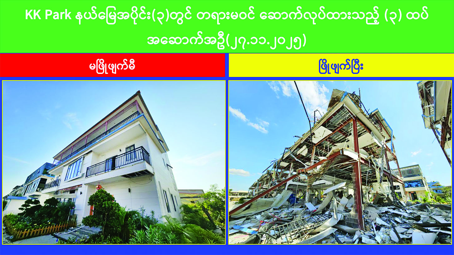 ထိုသို့ အွန်လိုင်းလိမ်လည်မှုများနှင့် အွန်လိုင်းလောင်းကစားမှုတိုက်ဖျက်ရေး လုပ်ငန်းများဆောင်ရွက်ရာတွင် မြဝတီ-မဲ့ထော်သလေး (KK Park) နယ်မြေအတွင်း ရှိ အွန်လိုင်းလိမ်လည်လောင်းကစားမှု များ ကျူးလွန်ရာတွင် အသုံးပြုခဲ့သည့် အဆောက်အအုံများကို အပိုင်း(၃)ပိုင်းခွဲ၍ စနစ်တကျ ဖြိုချဖျက်ဆီးခြင်းများ ဆောင်ရွက်လျက်ရှိရာ ယနေ့တွင် အပိုင်း (၃) နယ်မြေအတွင်းရှိ တရားမဝင် အဆောက်အအုံ ၁၀ လုံးကို ထပ်မံဖြိုချ ဖျက်ဆီးခဲ့သဖြင့် အပိုင်း (၃) နယ်မြေ အတွင်းရှိ အဆောက်အအုံ ၄၂၅ လုံးအနက် ယနေ့အထိ ၁၀၈ လုံး ဖြိုချဖျက်ဆီး ခဲ့ကြောင်းနှင့် KK Park နယ်မြေအတွင်းရှိ တရားမဝင်အဆောက်အအုံ စုစုပေါင်း ၆၃၅ လုံး အနက် ၂၅၆ လုံးကို ဖြိုချဖျက်ဆီးပြီးဖြစ်ကြောင်း သိရှိရသည်။