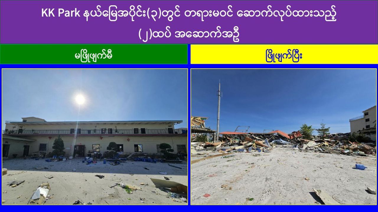ထိုသို့ အွန်လိုင်းလိမ်လည်မှုများနှင့် အွန်လိုင်းလောင်းကစားမှုတိုက်ဖျက်ရေး လုပ်ငန်းများဆောင်ရွက်ရာတွင် မြဝတီ-မဲထော်သလေး(KK Park)နယ်မြေအတွင်းရှိ အွန်လိုင်းလိမ်လည်လောင်းကစားမှုများကျူးလွန်ရာတွင်အသုံးပြုခဲ့သည့် အဆောက်အအုံများကို အပိုင်း(၃)ပိုင်းခွဲ၍ စနစ်တကျဖြိုချဖျက်ဆီးခြင်းများ ဆောင်ရွက်လျက်ရှိရာ ယနေ့တွင်အပိုင်း (၃) နယ်မြေအတွင်းရှိ တရားမဝင်အဆောက်အအုံ ၇ လုံးကို ထပ်မံဖြိုချဖျက်ဆီးခဲ့သဖြင့် အပိုင်း(၃)နယ်မြေအတွင်းရှိ အဆောက်အအုံ ၄၂၅ လုံးအနက် ယနေ့အထိ ၁၁၅ လုံး ဖြိုချဖျက်ဆီးခဲ့ကြောင်းနှင့် KK Park နယ်မြေအတွင်းရှိ တရားမဝင် အဆောက်အအုံ စုစုပေါင်း ၆၃၅ လုံး အနက် ၂၆၃ လုံးကို ဖြိုချဖျက်ဆီးပြီးဖြစ်ကြောင်းသိရှိရသည်။