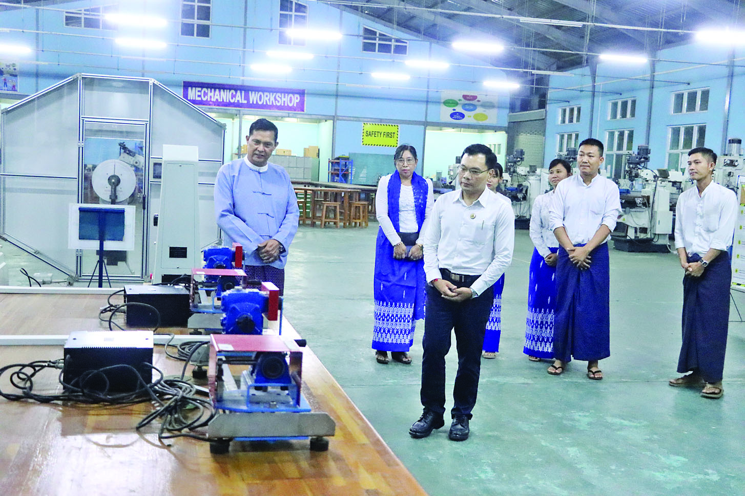 ထို့နောက် အစိုးရစက်မှုလက်မှုသိပ္ပံ (သန်လျင်) သို့ ရောက်ရှိရာ ကျောင်းအုပ်ကြီးက ဒီဇင်ဘာ ၁ ရက်တွင် ဖွင့်လှစ်မည့် ပထမနှစ်သင်တန်းများအတွက် ပြင်ဆင်ထားရှိမှုများ၊ သီလဝါအထူးစီးပွားရေးဇုန်ရှိ လုပ်ငန်းရှင်များနှင့် ပူးပေါင်းဆောင်ရွက်နေမှုအခြေအနေများကို ရှင်းလင်းတင်ပြရာ ဒုတိယဝန်ကြီးက ပြင်ပစက်မှုလုပ်ငန်းရှင်များနှင့် ပူးပေါင်းဆောင်ရွက်နေမှုများကို အရှိန် အဟုန်မြှင့်တင်ကာ သင်တန်းများကို သတ်မှတ်စံနှုန်းများအတိုင်း စဉ်ဆက်မပြတ် ဖွင့်လှစ်နိုင်ရေးအလေးထားဆောင်ရွက်သွားရန် တိုက်တွန်းမှာကြားကာ အလုပ်ရုံများသို့ သွားရောက်၍ လက်တွေ့ပြိုင်ပွဲများတွင် ကျောင်းသားများ ဆုရရှိသည့် သုတေသနပရောဂျက်များ၊ လက်တွေ့သုံးစက်ပစ္စည်း ကိရိယာများ တပ်ဆင်ထားရှိမှုအခြေအနေများကို ကြည့်ရှုစစ်ဆေးပြီး လိုအပ်သည်များ မှာကြားသည်။